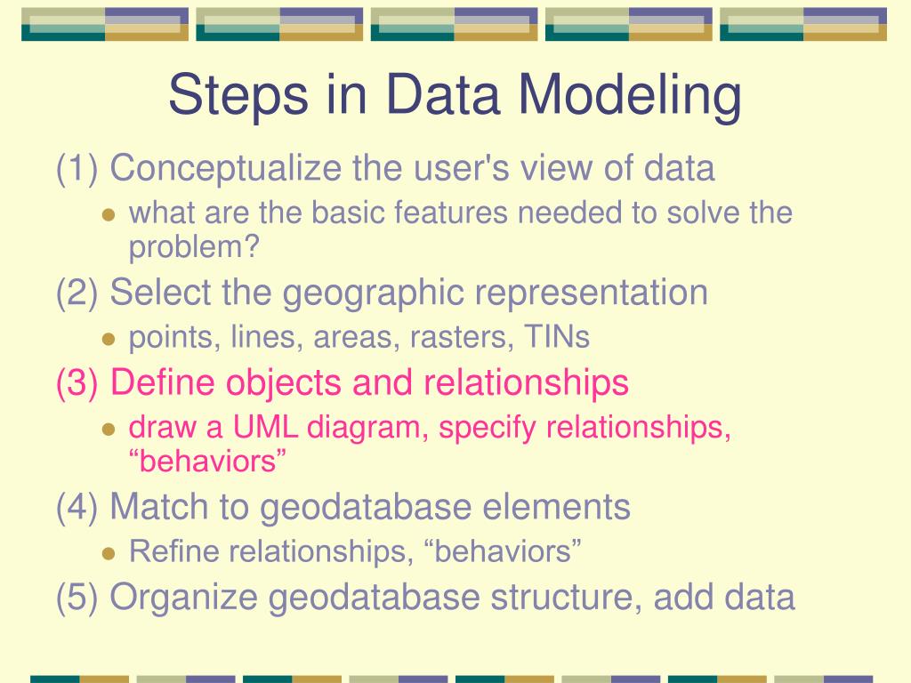 Steps in Data Modeling (1) Conceptualize the user's view of data • what are the basic features needed to solve the problem? (2) Select the geographic representation • points, lines, areas, rasters, TINs (3) Define objects and relationships • draw a UML diagram, specify relationships, “behaviors” (4) Match to geodatabase elements • Refine relationships, “behaviors” (5) Organize geodatabase structure, add data
