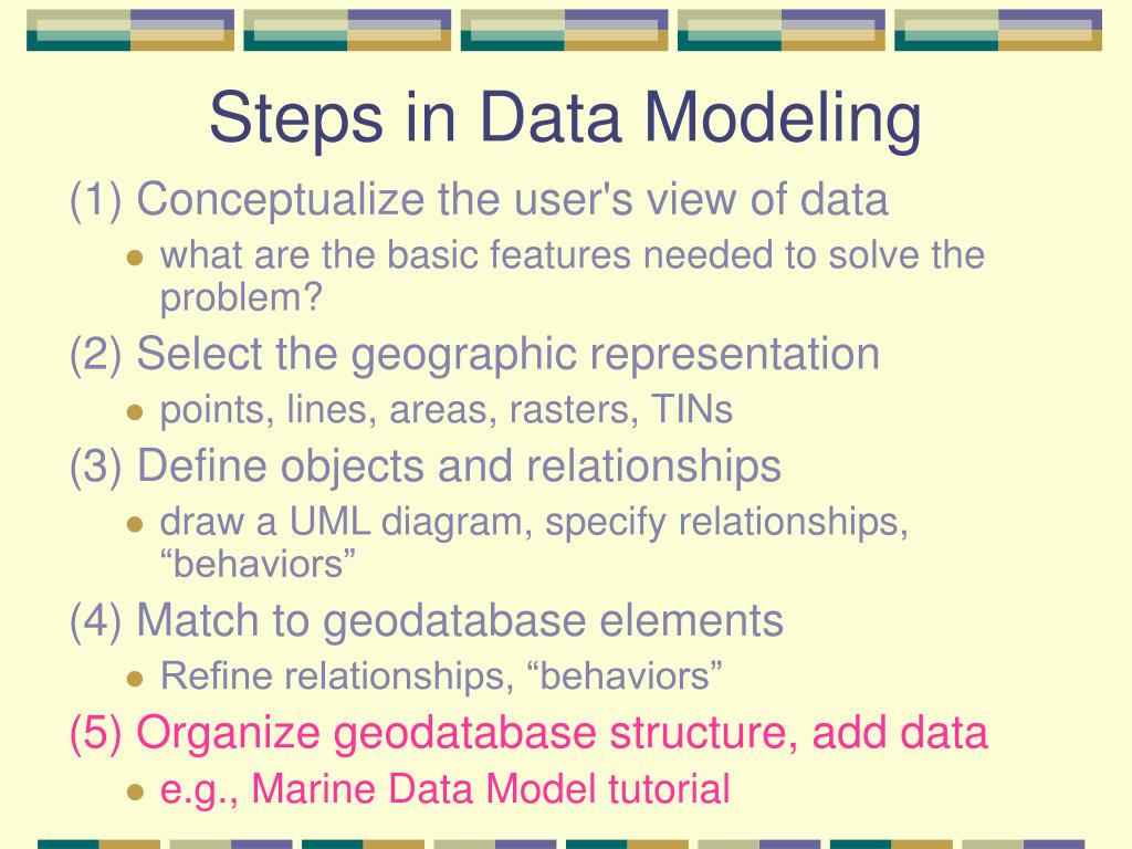 Steps in Data Modeling (1) Conceptualize the user's view of data • what are the basic features needed to solve the problem? (2) Select the geographic representation • points, lines, areas, rasters, TINs (3) Define objects and relationships • draw a UML diagram, specify relationships, “behaviors” (4) Match to geodatabase elements • Refine relationships, “behaviors” (5) Organize geodatabase structure, add data • e.g., Marine Data Model tutorial