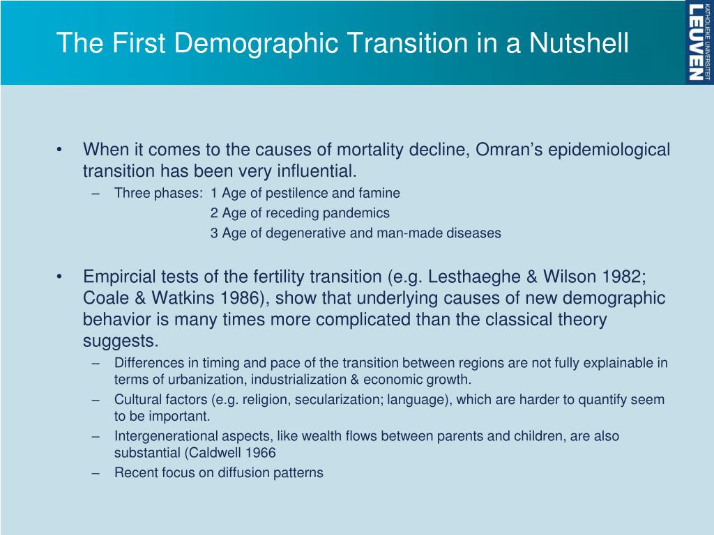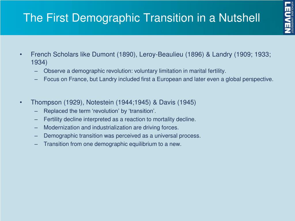 The First Demographic Transition in a Nutshell • French Scholars like Dumont (1890), Leroy-Beaulieu (1896) & Landry (1909; 1933; 1934) • Observe a demographic revolution: voluntary limitation in marital fertility. • Focus on France, but Landry included first a European and later even a global perspective. • Thompson (1929), Notestein (1944;1945) & Davis (1945) • Replaced the term ‘revolution’ by ‘transition’. • Fertility decline interpreted as a reaction to mortality decline. • Modernization and industrialization are driving forces. • Demographic transition was perceived as a universal process. • Transition from one demographic equilibrium to a new.