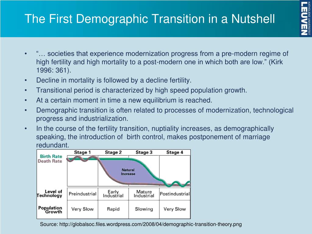 The First Demographic Transition in a Nutshell “… societies that experience modernization progress from a pre-modern regime of high fertility and high mortality to a post-modern one in which both are low.” (Kirk 1996: 361). Decline in mortality is followed by a decline fertility. Transitional period is characterized by high speed population growth. At a certain moment in time a new equilibrium is reached. Demographic transition is often related to processes of modernization, technological progress and industrialization. In the course of the fertility transition, nuptiality increases, as demographically speaking, the introduction of birth control, makes postponement of marriage redundant. Source: http://globalsoc.files.wordpress.com/2008/04/demographic-transition-theory.png