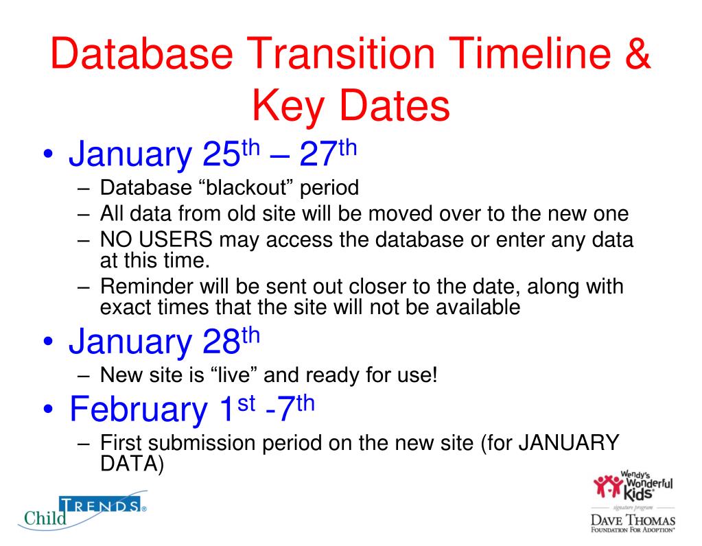 Thank you for your patience as we make this transition to the new site! REMINDERS Child Trends and/or DTFA will be in touch over the next several weeks to provide important info for the transition Please read all emails/memos thoroughly Don’t hesitate to contact us with any questions! wwksupport@childtrends.org; 1-800-217-6741 Thank you!