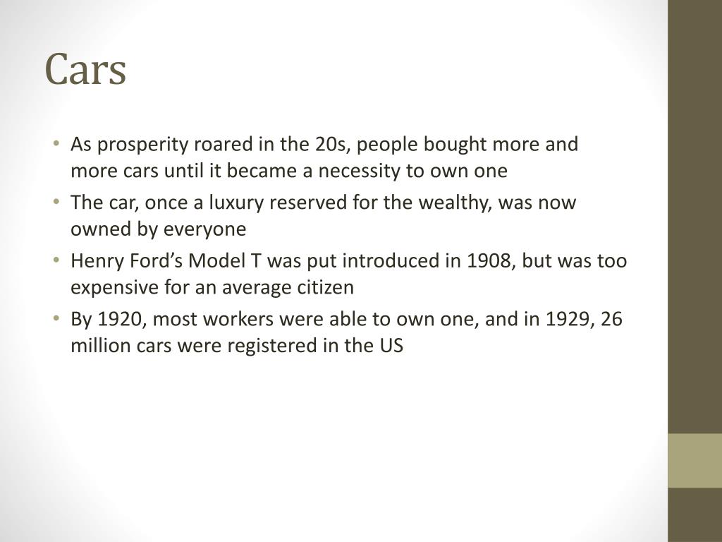 Cars • As prosperity roared in the 20s, people bought more and more cars until it became a necessity to own one • The car, once a luxury reserved for the wealthy, was now owned by everyone • Henry Ford’s Model T was put introduced in 1908, but was too expensive for an average citizen • By 1920, most workers were able to own one, and in 1929, 26 million cars were registered in the US
