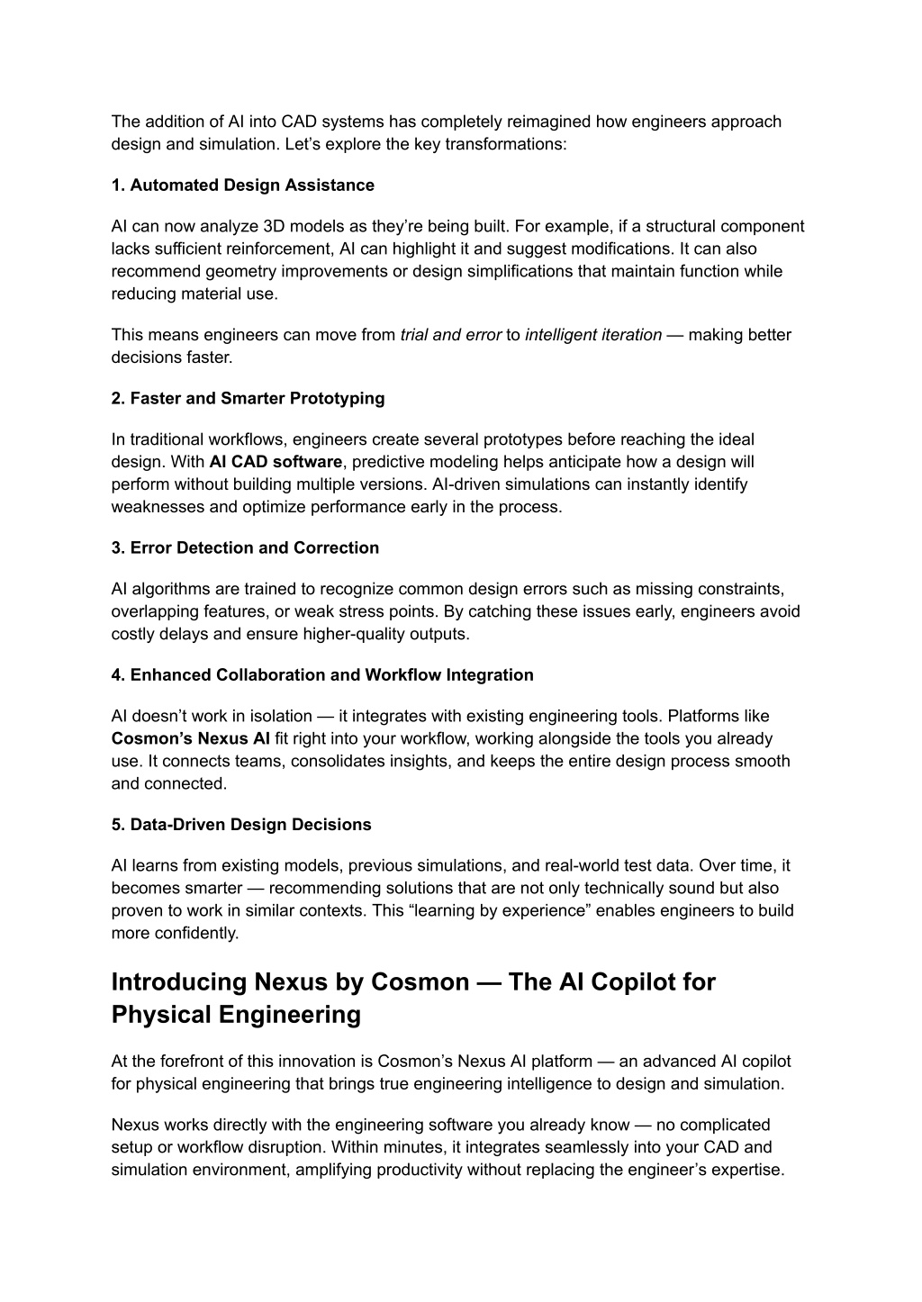 The addition of AI into CAD systems has completely reimagined how engineers approach design and simulation. Let’s explore the key transformations: 1. Automated Design Assistance AI can now analyze 3D models as they’re being built. For example, if a structural component lacks sufficient reinforcement, AI can highlight it and suggest modifications. It can also recommend geometry improvements or design simplifications that maintain function while reducing material use. This means engineers can move from trial and error to intelligent iteration — making better decisions faster. 2. Faster and Smarter Prototyping In traditional workflows, engineers create several prototypes before reaching the ideal design. With AI CAD software, predictive modeling helps anticipate how a design will perform without building multiple versions. AI-driven simulations can instantly identify weaknesses and optimize performance early in the process. 3. Error Detection and Correction AI algorithms are trained to recognize common design errors such as missing constraints, overlapping features, or weak stress points. By catching these issues early, engineers avoid costly delays and ensure higher-quality outputs. 4. Enhanced Collaboration and Workflow Integration AI doesn’t work in isolation — it integrates with existing engineering tools. Platforms like Cosmon’s Nexus AI fit right into your workflow, working alongside the tools you already use. It connects teams, consolidates insights, and keeps the entire design process smooth and connected. 5. Data-Driven Design Decisions AI learns from existing models, previous simulations, and real-world test data. Over time, it becomes smarter — recommending solutions that are not only technically sound but also proven to work in similar contexts. This “learning by experience” enables engineers to build more confidently. Introducing Nexus by Cosmon — The AI Copilot for Physical Engineering At the forefront of this innovation is Cosmon’s Nexus AI platform — an advanced AI copilot for physical engineering that brings true engineering intelligence to design and simulation. Nexus works directly with the engineering software you already know — no complicated setup or workflow disruption. Within minutes, it integrates seamlessly into your CAD and simulation environment, amplifying productivity without replacing the engineer’s expertise.