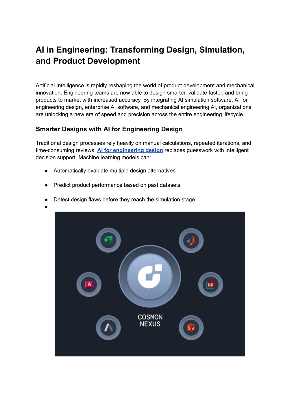 AI in Engineering: Transforming Design, Simulation, and Product Development Artificial Intelligence is rapidly reshaping the world of product development and mechanical innovation. Engineering teams are now able to design smarter, validate faster, and bring products to market with increased accuracy. By integrating AI simulation software, AI for engineering design, enterprise AI software, and mechanical engineering AI, organizations are unlocking a new era of speed and precision across the entire engineering lifecycle. Smarter Designs with AI for Engineering Design Traditional design processes rely heavily on manual calculations, repeated iterations, and time-consuming reviews. AI for engineering design replaces guesswork with intelligent decision support. Machine learning models can: ● Automatically evaluate multiple design alternatives ● Predict product performance based on past datasets ● Detect design flaws before they reach the simulation stage ●