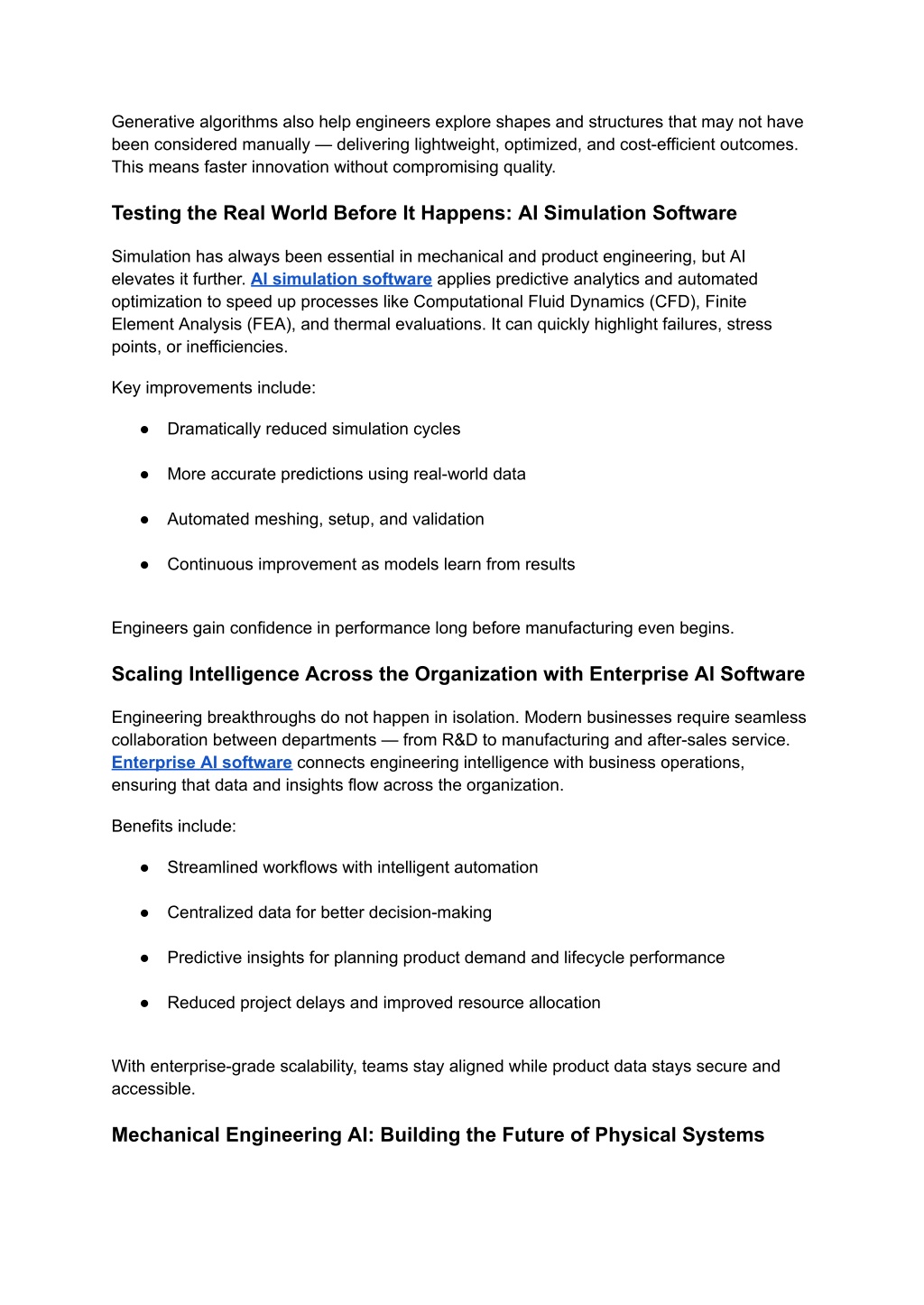 Generative algorithms also help engineers explore shapes and structures that may not have been considered manually — delivering lightweight, optimized, and cost-efficient outcomes. This means faster innovation without compromising quality. Testing the Real World Before It Happens: AI Simulation Software Simulation has always been essential in mechanical and product engineering, but AI elevates it further. AI simulation software applies predictive analytics and automated optimization to speed up processes like Computational Fluid Dynamics (CFD), Finite Element Analysis (FEA), and thermal evaluations. It can quickly highlight failures, stress points, or inefficiencies. Key improvements include: ● Dramatically reduced simulation cycles ● More accurate predictions using real-world data ● Automated meshing, setup, and validation ● Continuous improvement as models learn from results Engineers gain confidence in performance long before manufacturing even begins. Scaling Intelligence Across the Organization with Enterprise AI Software Engineering breakthroughs do not happen in isolation. Modern businesses require seamless collaboration between departments — from R&D to manufacturing and after-sales service. Enterprise AI software connects engineering intelligence with business operations, ensuring that data and insights flow across the organization. Benefits include: ● Streamlined workflows with intelligent automation ● Centralized data for better decision-making ● Predictive insights for planning product demand and lifecycle performance ● Reduced project delays and improved resource allocation With enterprise-grade scalability, teams stay aligned while product data stays secure and accessible. Mechanical Engineering AI: Building the Future of Physical Systems
