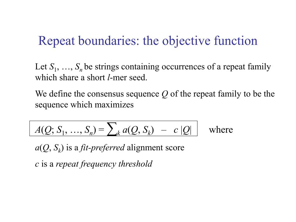 Repeat boundaries: the objective function Let S1, …, Snbe strings containing occurrences of a repeat family which share a short l-mer seed. We define the consensus sequence Q of the repeat family to be the sequence which maximizes A(Q; S1, …, Sn) = ∑ka(Q, Sk) where a(Q, Sk) is a fit-preferred alignment score