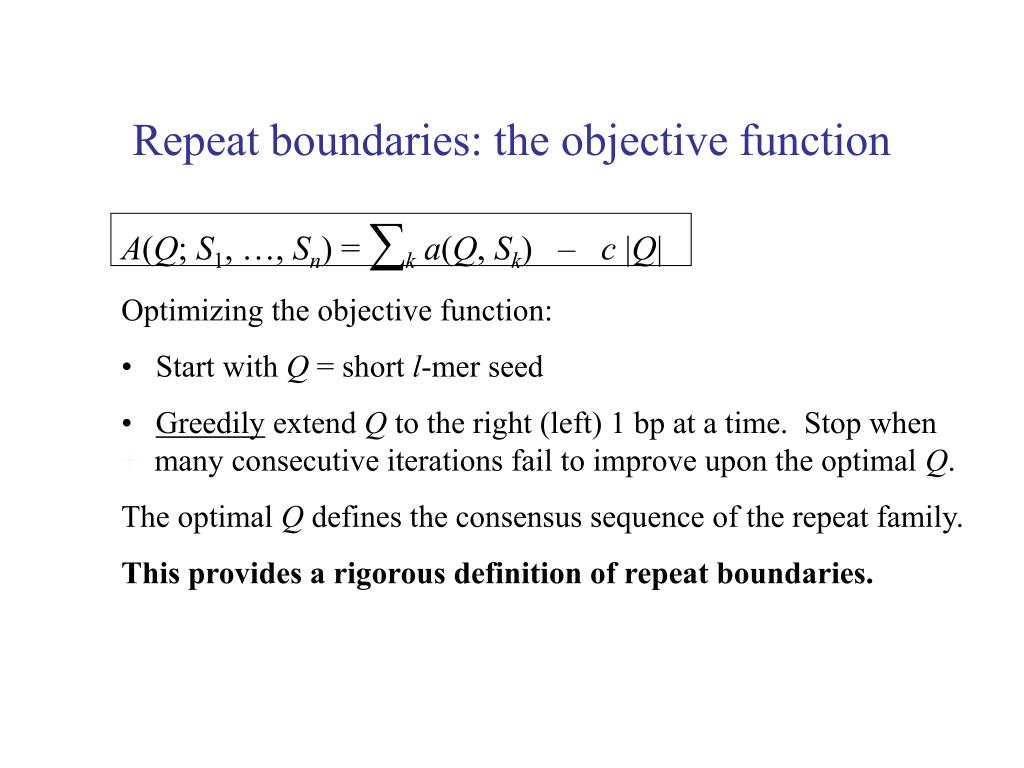 Repeat boundaries: the objective function • A(Q; S1, …, Sn) = ∑ka(Q, Sk) – c |Q| Optimizing the objective function: • Start with Q = short l-mer seed • Greedily extend Q to the right (left) 1 bp at a time. Stop when + many consecutive iterations fail to improve upon the optimal Q. The optimal Q defines the consensus sequence of the repeat family. This provides a rigorous definition of repeat boundaries.