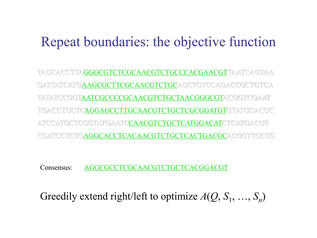 Repeat boundaries: the objective function TAGCACCTTAGGGCGTCTCGCAACGTCTGCCCACGAACGTTAATCAGTAA GATTATCATGAAGCGCTTCGCAACGTCTGCAGCTGTCCAGACCGCTGTCA TATATCCGGTAATCGCCCCGCAACGTCTGCTAACGGGCGTACGGTCGAAT TGACCTGCTCAGGAGCCTTGCAACGTCTGCTCGCGGATGTGTATGCACGC ATCCATGCTCGGTATGAATCCAACGTCTGCTCATGGACATCTCATGACGT CGATCCTCTGAGGCACCTCACAACGTCTGCTCACTGACGCACGGTTGCTG Consensus: AGGCGCCTCGCAACGTCTGCTCACGGACGT Greedily extend right/left to optimize A(Q, S1, …, Sn)