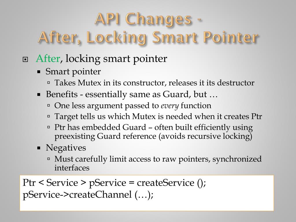 API Changes -After, Locking Smart Pointer • After, locking smart pointer • Smart pointer • Takes Mutex in its constructor, releases it its destructor • Benefits - essentially same as Guard, but … • One less argument passed to every function • Target tells us which Mutex is needed when it creates Ptr • Ptr has embedded Guard – often built efficiently using preexisting Guard reference (avoids recursive locking) • Negatives • Must carefully limit access to raw pointers, synchronized interfaces Ptr < Service > pService = createService (); pService->createChannel (…);