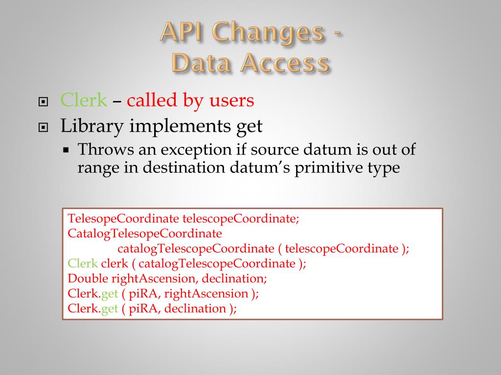 API Changes -Data Access • Clerk – called by users • Library implements get • Throws an exception if source datum is out of range in destination datum’s primitive type TelesopeCoordinatetelescopeCoordinate; CatalogTelesopeCoordinate catalogTelescopeCoordinate ( telescopeCoordinate ); Clerkclerk ( catalogTelescopeCoordinate ); Double rightAscension, declination; Clerk.get ( piRA, rightAscension ); Clerk.get ( piRA, declination );