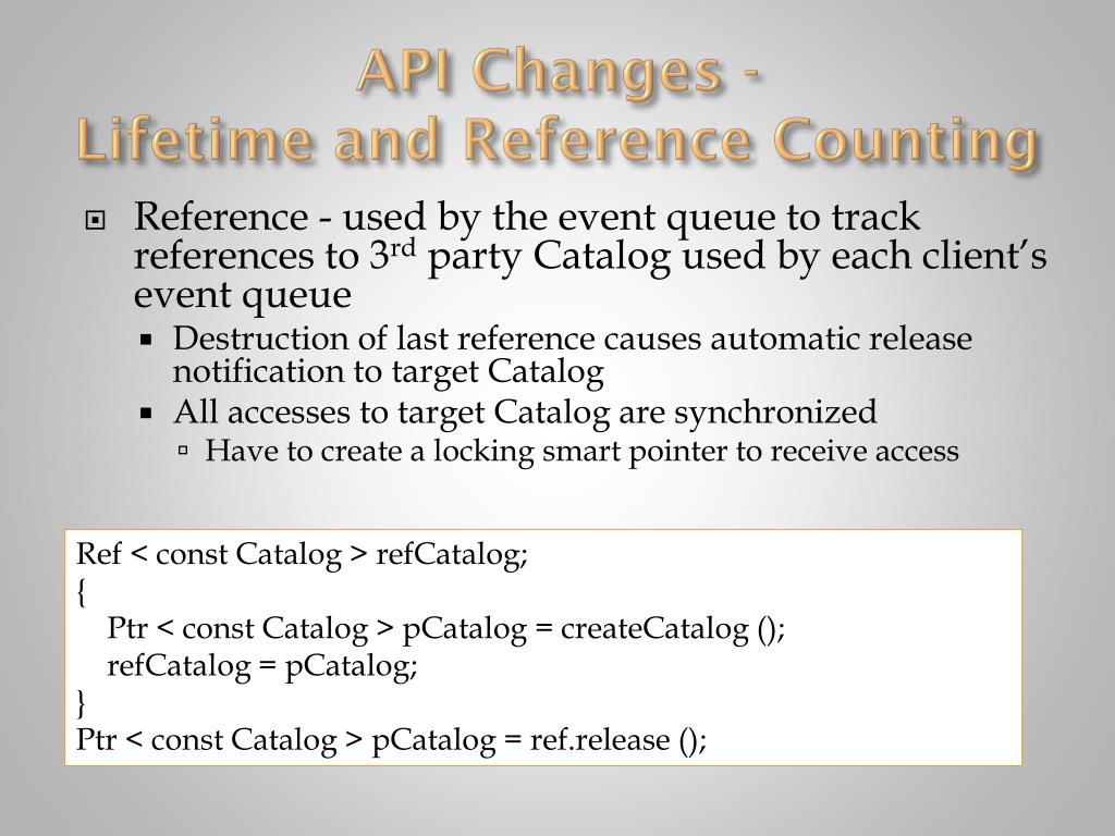 API Changes -Lifetime and Reference Counting • Reference - used by the event queue to track references to 3rd party Catalog used by each client’s event queue • Destruction of last reference causes automatic release notification to target Catalog • All accesses to target Catalog are synchronized • Have to create a locking smart pointer to receive access Ref < const Catalog > refCatalog; { Ptr < const Catalog > pCatalog = createCatalog (); refCatalog = pCatalog; } Ptr < const Catalog > pCatalog = ref.release ();