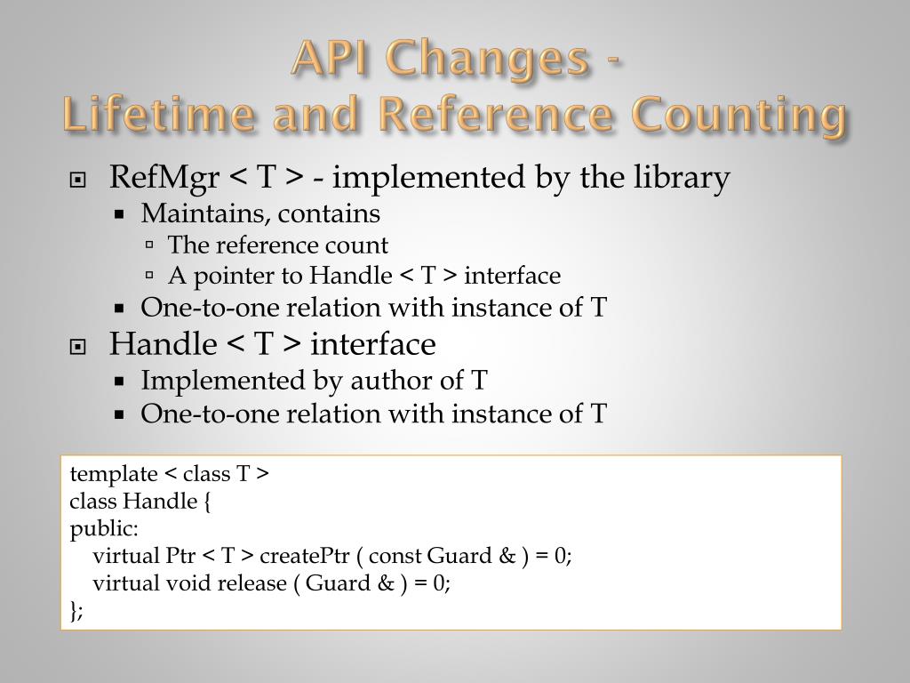 API Changes -Lifetime and Reference Counting • RefMgr < T > - implemented by the library • Maintains, contains • The reference count • A pointer to Handle < T > interface • One-to-one relation with instance of T • Handle < T > interface • Implemented by author of T • One-to-one relation with instance of T template < class T > class Handle { public: virtual Ptr < T > createPtr ( const Guard & ) = 0; virtual void release ( Guard & ) = 0; };