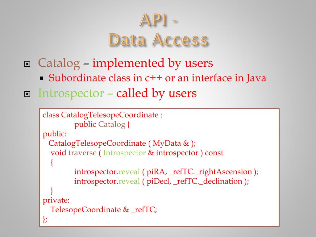 API -Data Access • Catalog – implemented by users • Subordinate class in c++ or an interface in Java • Introspector – called by users class CatalogTelesopeCoordinate : public Catalog{ public: CatalogTelesopeCoordinate ( MyData & ); void traverse ( Introspector & introspector ) const { introspector.reveal ( piRA, _refTC._rightAscension ); introspector.reveal ( piDecl, _refTC._declination ); } private: TelesopeCoordinate & _refTC; };