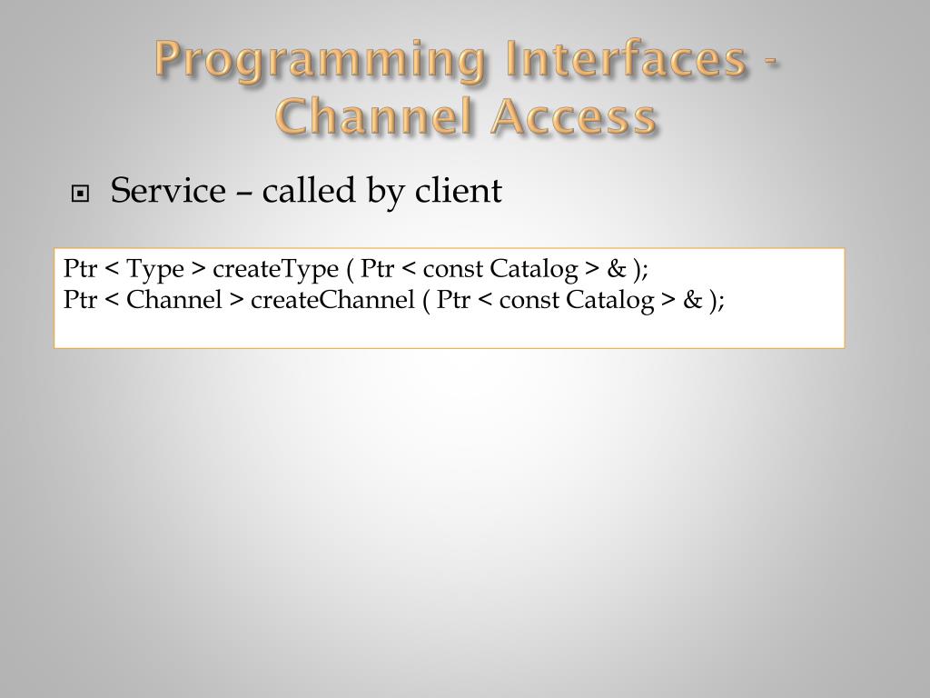 Programming Interfaces -Channel Access • Service – called by client Ptr < Type > createType ( Ptr < const Catalog > & ); Ptr < Channel > createChannel ( Ptr < const Catalog > & );