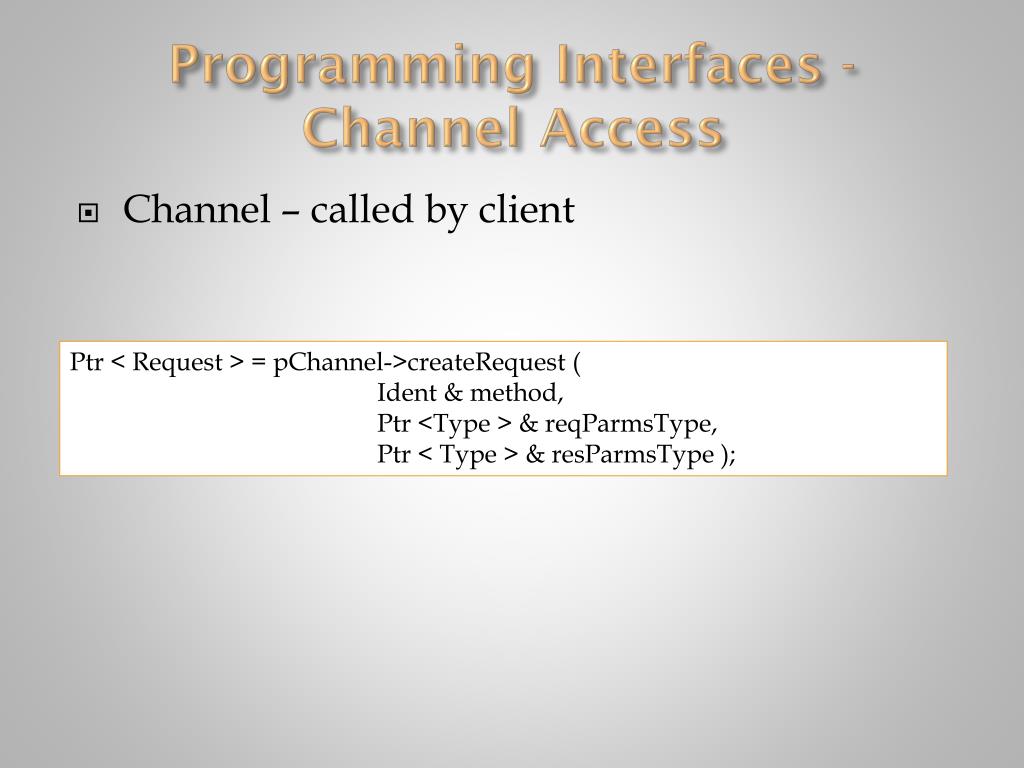 Programming Interfaces -Channel Access • Channel – called by client Ptr < Request > = pChannel->createRequest ( Ident & method, Ptr <Type > & reqParmsType, Ptr < Type > & resParmsType );