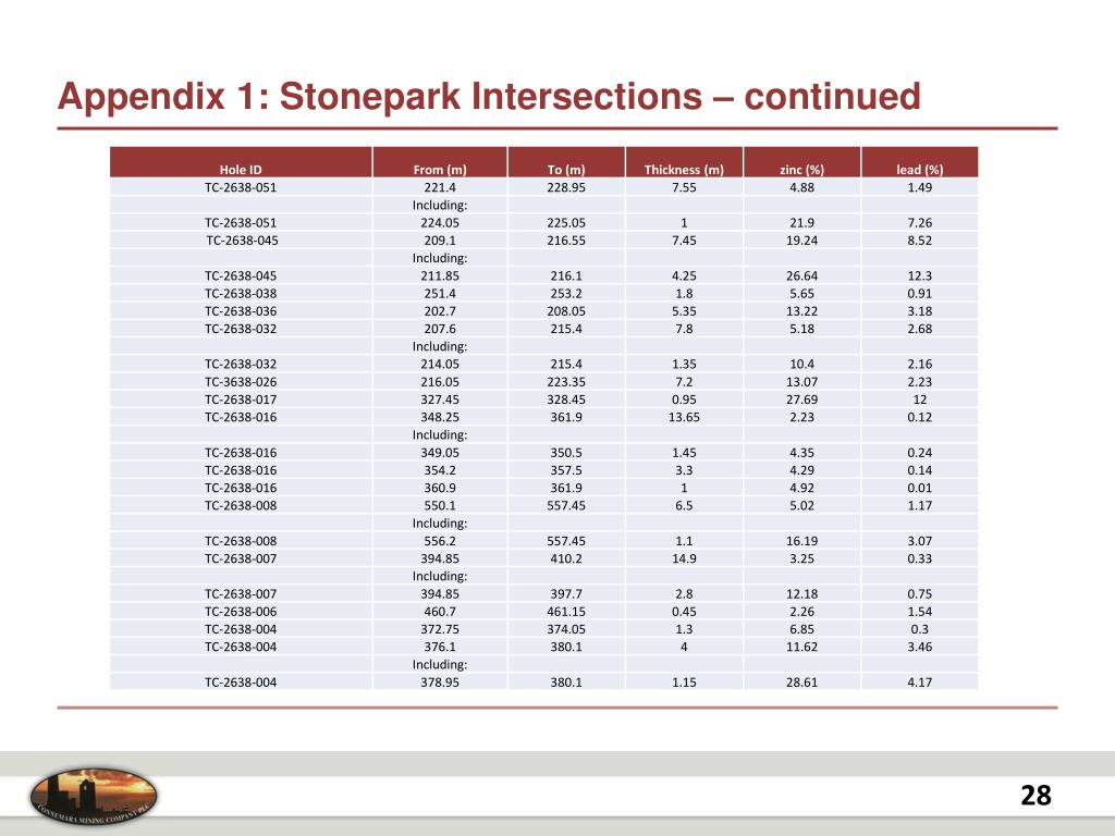 Appendix 2: Stonepark Discovery History – 2008 14Mt @ 12% Zn+Pb TC-2638-012 – 0.95m @ 2.37% Zn & 4.73% Pb from 203.15m TC-2638-007 – 14.9m @ 3.25% Zn & 0.33% Pb from 394.85m Incl. 2.8m @ 12.18% Zn & 0.75% Pb TC-2638-008 – 6.5m @ 5.02% Zn & 1.17% Zn from 550.1m
