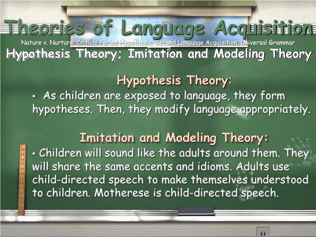 Theories of Language AcquisitionNature v. Nurture: Critical Period Hypothesis; Second Language Acquisition, Universal GrammarHypothesis Theory; Imitation and Modeling Theory Hypothesis Theory: As children are exposed to language, they form hypotheses. Then, they modify language appropriately. Imitation and Modeling Theory: Children will sound like the adults around them. They will share the same accents and idioms. Adults use child-directed speech to make themselves understood to children. Motherese is child-directed speech.