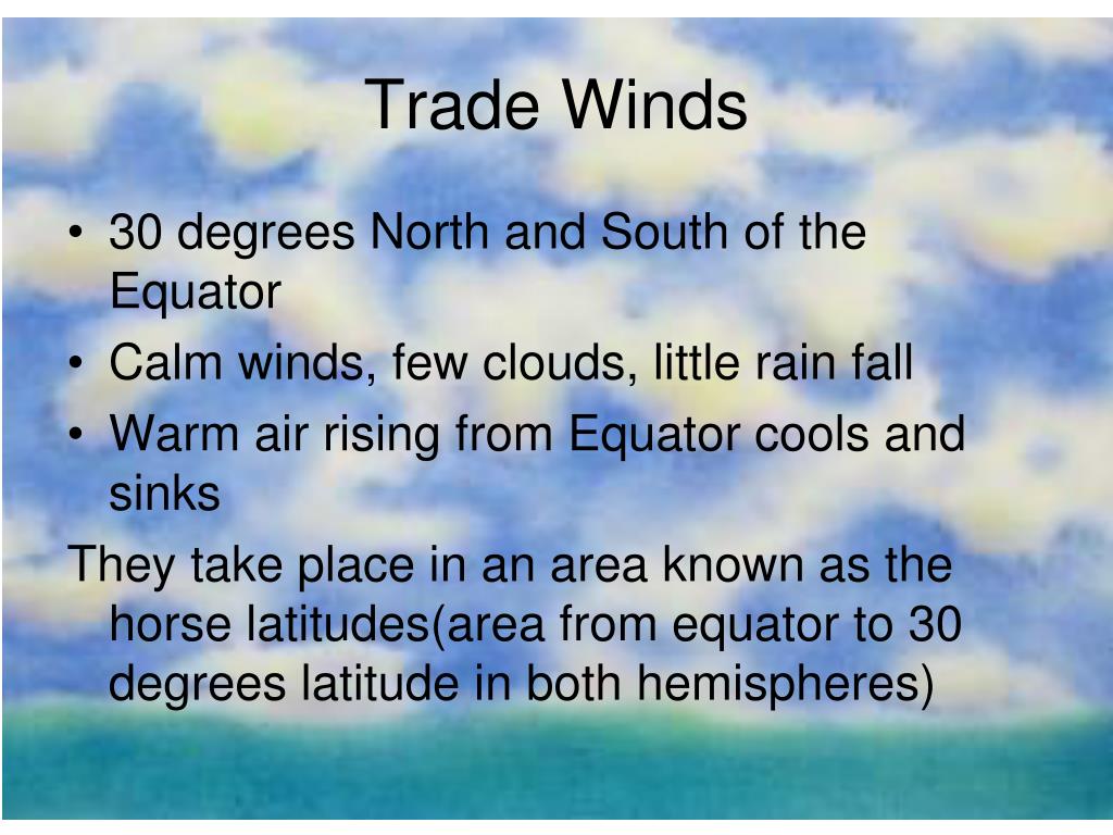 Trade Winds • 30 degrees North and South of the Equator • Calm winds, few clouds, little rain fall • Warm air rising from Equator cools and sinks They take place in an area known as the horse latitudes(area from equator to 30 degrees latitude in both hemispheres)