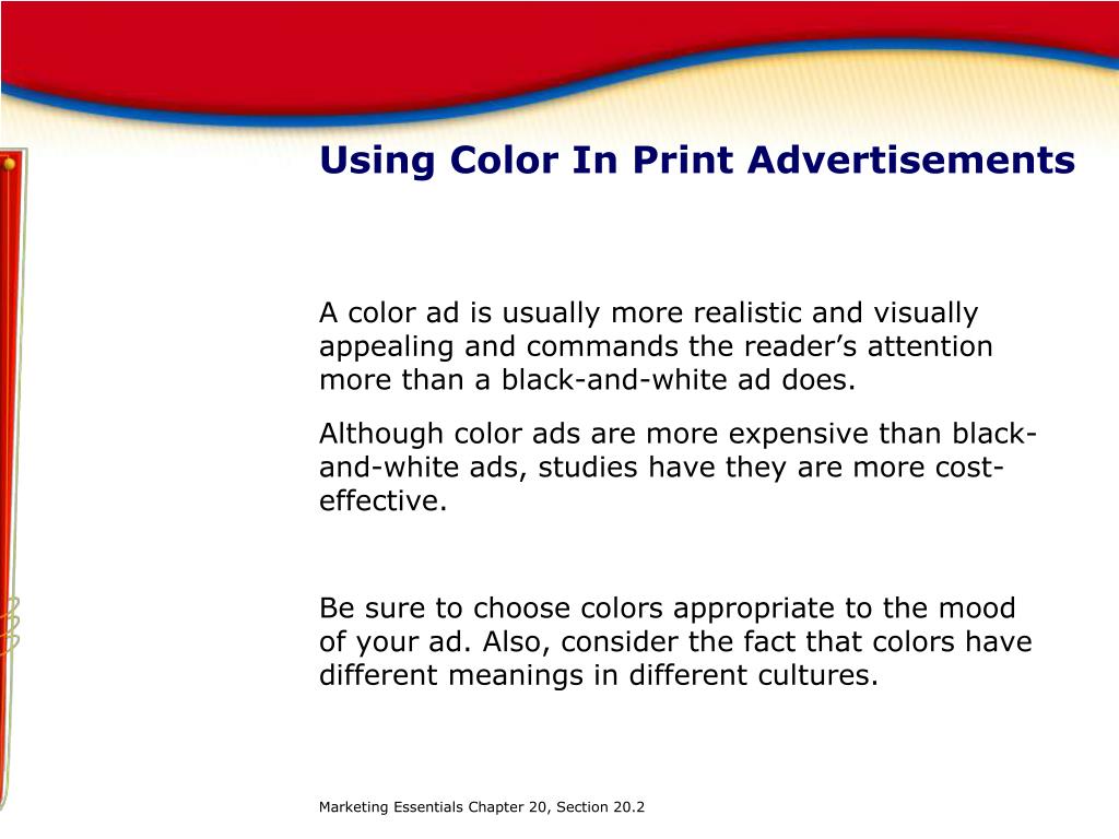 Using Color In Print Advertisements A color ad is usually more realistic and visually appealing and commands the reader’s attention more than a black-and-white ad does. Although color ads are more expensive than black-and-white ads, studies have they are more cost-effective. Be sure to choose colors appropriate to the mood of your ad. Also, consider the fact that colors have different meanings in different cultures. Marketing Essentials Chapter 20, Section 20.2