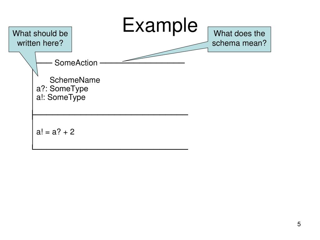 Example What should be written here? What does the schema mean? ┌─── SomeAction ─────────────── SchemeName a?: SomeType a!: SomeType ├─────────────────────────── a! = a? + 2 └───────────────────────────