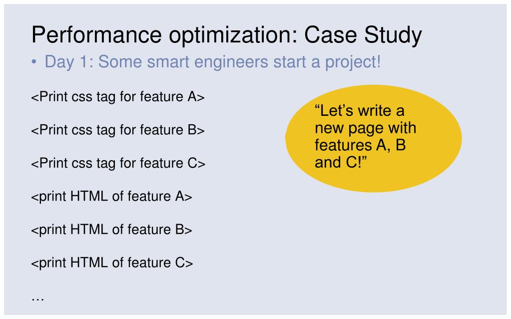 Performance optimization: Case Study • Day 1: Some smart engineers start a project! <Print css tag for feature A> <Print css tag for feature B> <Print css tag for feature C> <print HTML of feature A> <print HTML of feature B> <print HTML of feature C> … “Let’s write a new page with features A, B and C!”