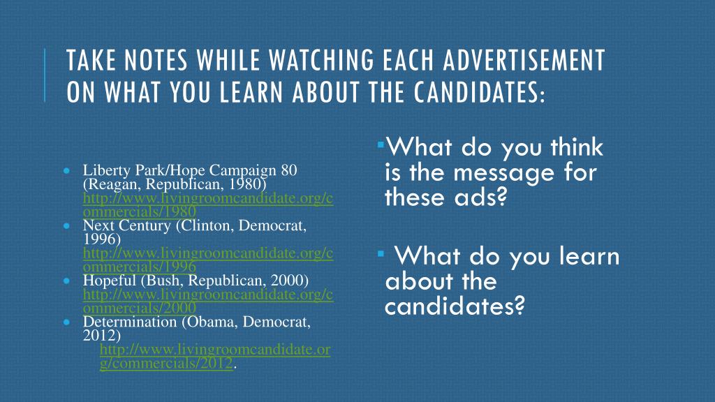 take notes while watching each advertisement on what you learn about the candidates: • Liberty Park/Hope Campaign 80 (Reagan, Republican, 1980) http://www.livingroomcandidate.org/commercials/1980 • Next Century (Clinton, Democrat, 1996) http://www.livingroomcandidate.org/commercials/1996 • Hopeful (Bush, Republican, 2000) http://www.livingroomcandidate.org/commercials/2000 • Determination (Obama, Democrat, 2012) • http://www.livingroomcandidate.org/commercials/2012. • What do you think is the message for these ads? • What do you learn about the candidates?