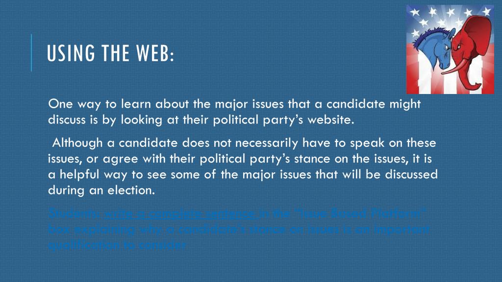 Using the web: • One way to learn about the major issues that a candidate might discuss is by looking at their political party’s website. • Although a candidate does not necessarily have to speak on these issues, or agree with their political party’s stance on the issues, it is a helpful way to see some of the major issues that will be discussed during an election. • Students: write a complete sentence in the “Issue Based Platform” box explaining why a candidate’s stance on issues is an important qualification to consider