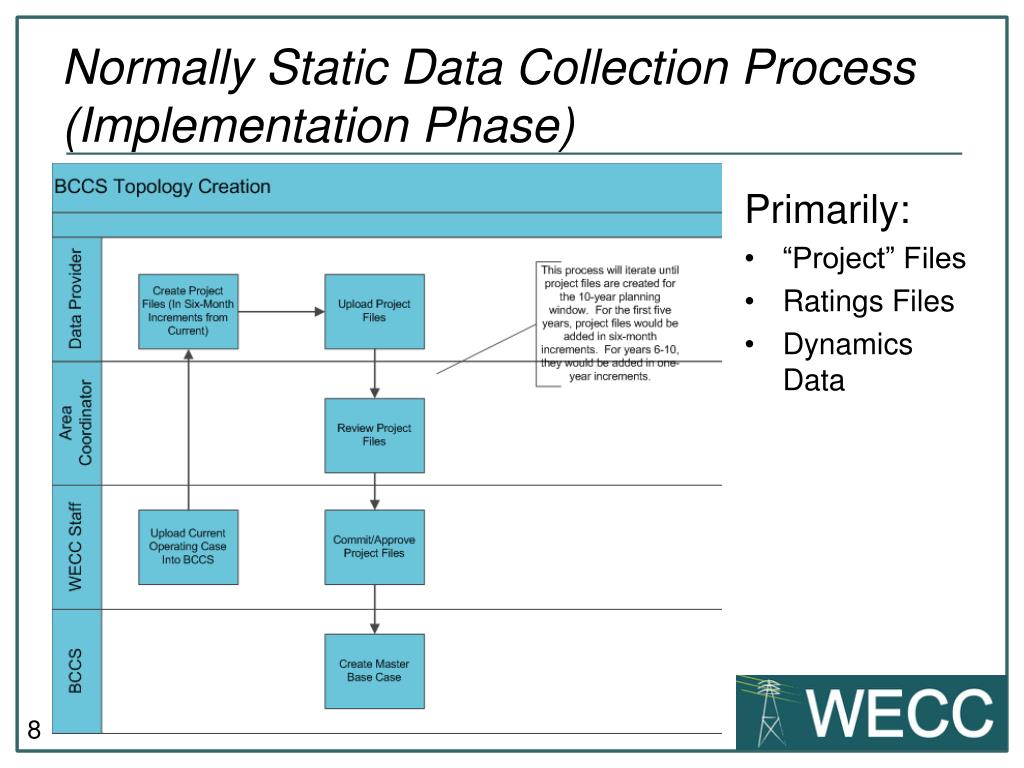 Enoch Davies Staff Engineer, WECC. BCCS Data Collection Process Proposal Technical Studies Subcommittee May 16, 2013. Assumptions. The current data collection process outlined in the Data Preparation Manual will not work with the Base Case Coordination System (BCCS)