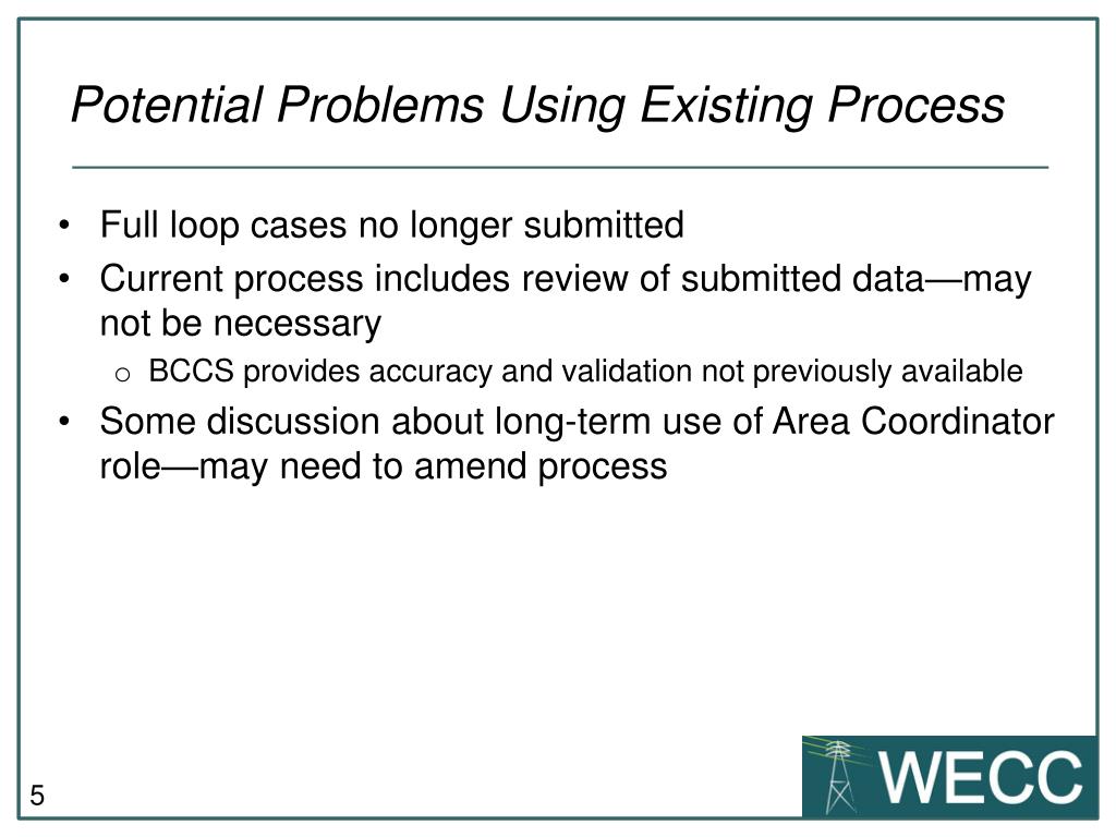 Potential Problems Using Existing Process • Full loop cases no longer submitted • Current process includes review of submitted data—may not be necessary • BCCS provides accuracy and validation not previously available • Some discussion about long-term use of Area Coordinator role—may need to amend process