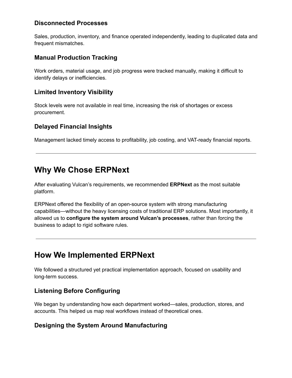 2. Disconnected Processes Sales, production, inventory, and finance operated independently, leading to duplicated data and frequent mismatches. Manual Production Tracking Work orders, material usage, and job progress were tracked manually, making it difficult to identify delays or inefficiencies. Limited Inventory Visibility Stock levels were not available in real time, increasing the risk of shortages or excess procurement. Delayed Financial Insights Management lacked timely access to profitability, job costing, and VAT-ready financial reports. Why We Chose ERPNext After evaluating Vulcan’s requirements, we recommended ERPNext as the most suitable platform. ERPNext offered the flexibility of an open-source system with strong manufacturing capabilities—without the heavy licensing costs of traditional ERP solutions. Most importantly, it allowed us to configure the system around Vulcan’s processes, rather than forcing the business to adapt to rigid software rules. How We Implemented ERPNext We followed a structured yet practical implementation approach, focused on usability and long-term success. Listening Before Configuring We began by understanding how each department worked—sales, production, stores, and accounts. This helped us map real workflows instead of theoretical ones. Designing the System Around Manufacturing