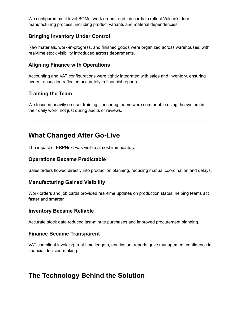 3. We configured multi-level BOMs, work orders, and job cards to reflect Vulcan’s door manufacturing process, including product variants and material dependencies. Bringing Inventory Under Control Raw materials, work-in-progress, and finished goods were organized across warehouses, with real-time stock visibility introduced across departments. Aligning Finance with Operations Accounting and VAT configurations were tightly integrated with sales and inventory, ensuring every transaction reflected accurately in financial reports. Training the Team We focused heavily on user training—ensuring teams were comfortable using the system in their daily work, not just during audits or reviews. What Changed After Go-Live The impact of ERPNext was visible almost immediately. Operations Became Predictable Sales orders flowed directly into production planning, reducing manual coordination and delays. Manufacturing Gained Visibility Work orders and job cards provided real-time updates on production status, helping teams act faster and smarter. Inventory Became Reliable Accurate stock data reduced last-minute purchases and improved procurement planning. Finance Became Transparent VAT-compliant invoicing, real-time ledgers, and instant reports gave management confidence in financial decision-making. The Technology Behind the Solution