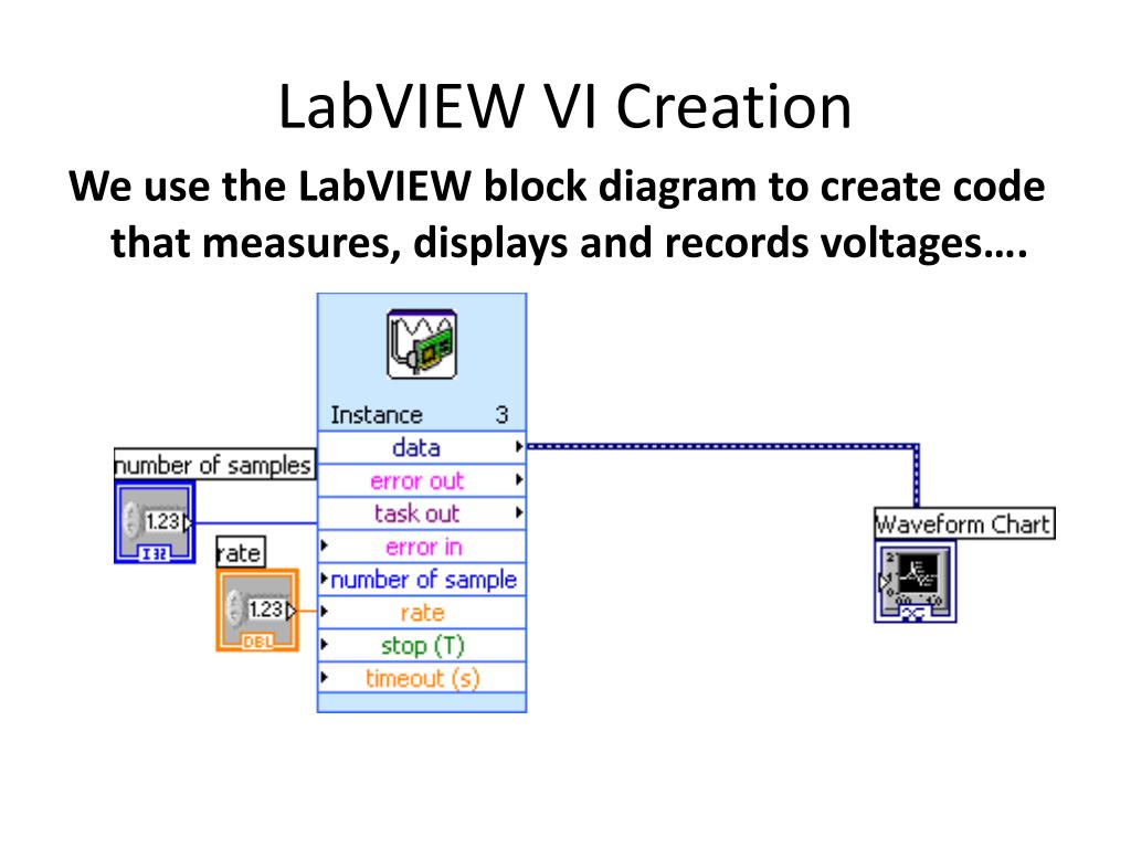 LabVIEW VI Creation We use the LabVIEW block diagram to create code that measures, displays and records voltages….