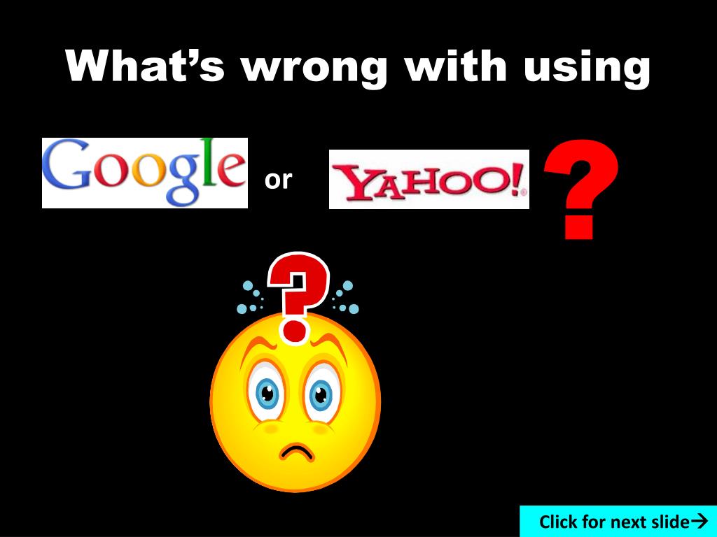 Why not Google or Yahoo? No standards: • Random organization. • Often, commercial sites or sites soliciting donations dominate search results. Click for next slide