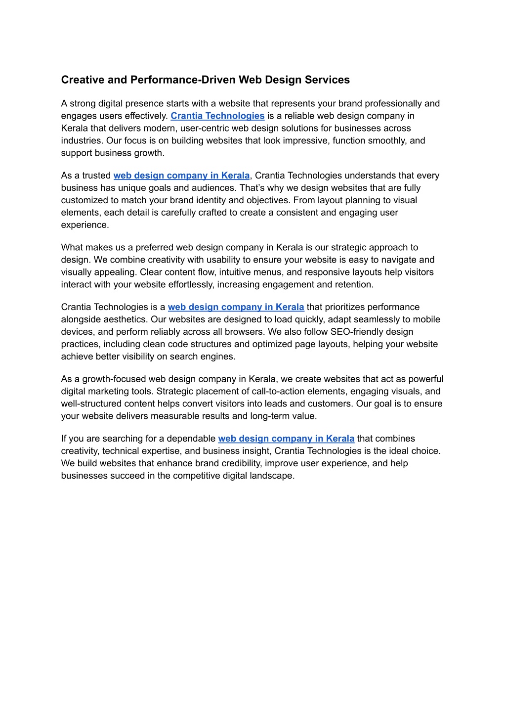 Creative and Performance-Driven Web Design Services A strong digital presence starts with a website that represents your brand professionally and engages users effectively. Crantia Technologies is a reliable web design company in Kerala that delivers modern, user-centric web design solutions for businesses across industries. Our focus is on building websites that look impressive, function smoothly, and support business growth. As a trusted web design company in Kerala, Crantia Technologies understands that every business has unique goals and audiences. That’s why we design websites that are fully customized to match your brand identity and objectives. From layout planning to visual elements, each detail is carefully crafted to create a consistent and engaging user experience. What makes us a preferred web design company in Kerala is our strategic approach to design. We combine creativity with usability to ensure your website is easy to navigate and visually appealing. Clear content flow, intuitive menus, and responsive layouts help visitors interact with your website effortlessly, increasing engagement and retention. Crantia Technologies is a web design company in Kerala that prioritizes performance alongside aesthetics. Our websites are designed to load quickly, adapt seamlessly to mobile devices, and perform reliably across all browsers. We also follow SEO-friendly design practices, including clean code structures and optimized page layouts, helping your website achieve better visibility on search engines. As a growth-focused web design company in Kerala, we create websites that act as powerful digital marketing tools. Strategic placement of call-to-action elements, engaging visuals, and well-structured content helps convert visitors into leads and customers. Our goal is to ensure your website delivers measurable results and long-term value. If you are searching for a dependable web design company in Kerala that combines creativity, technical expertise, and business insight, Crantia Technologies is the ideal choice. We build websites that enhance brand credibility, improve user experience, and help businesses succeed in the competitive digital landscape.