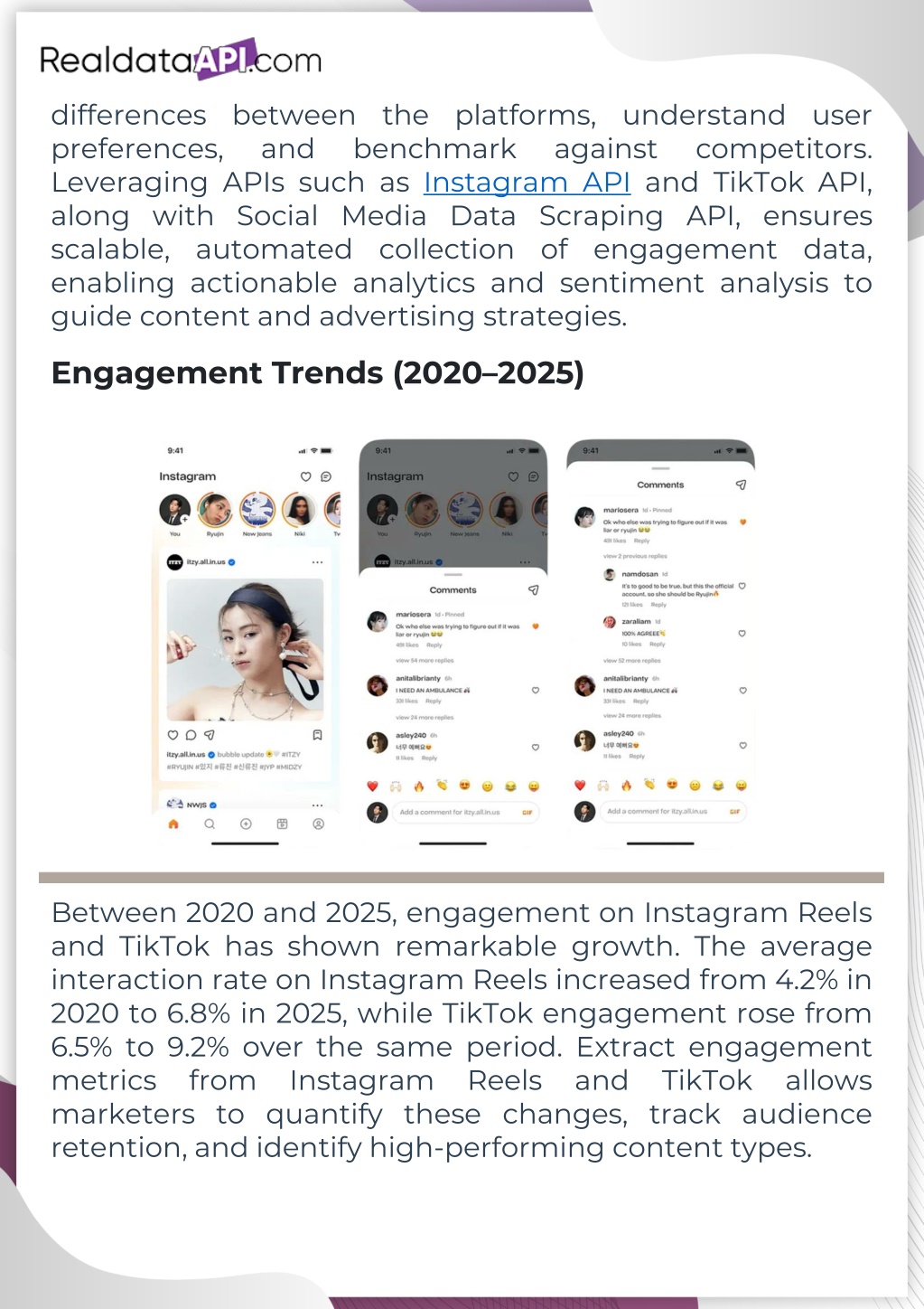 differences between the platforms, understand user preferences, and benchmark against competitors. Leveraging APIs such as Instagram API and TikTok API, along with Social Media Data Scraping API, ensures scalable, automated collection of engagement data, enabling actionable analytics and sentiment analysis to guide content and advertising strategies. Engagement Trends (2020–2025) Between 2020 and 2025, engagement on Instagram Reels and TikTok has shown remarkable growth. The average interaction rate on Instagram Reels increased from 4.2% in 2020 to 6.8% in 2025, while TikTok engagement rose from 6.5% to 9.2% over the same period. Extract engagement metrics from Instagram Reels and TikTok allows marketers to quantify these changes, track audience retention, and identify high-performing content types.