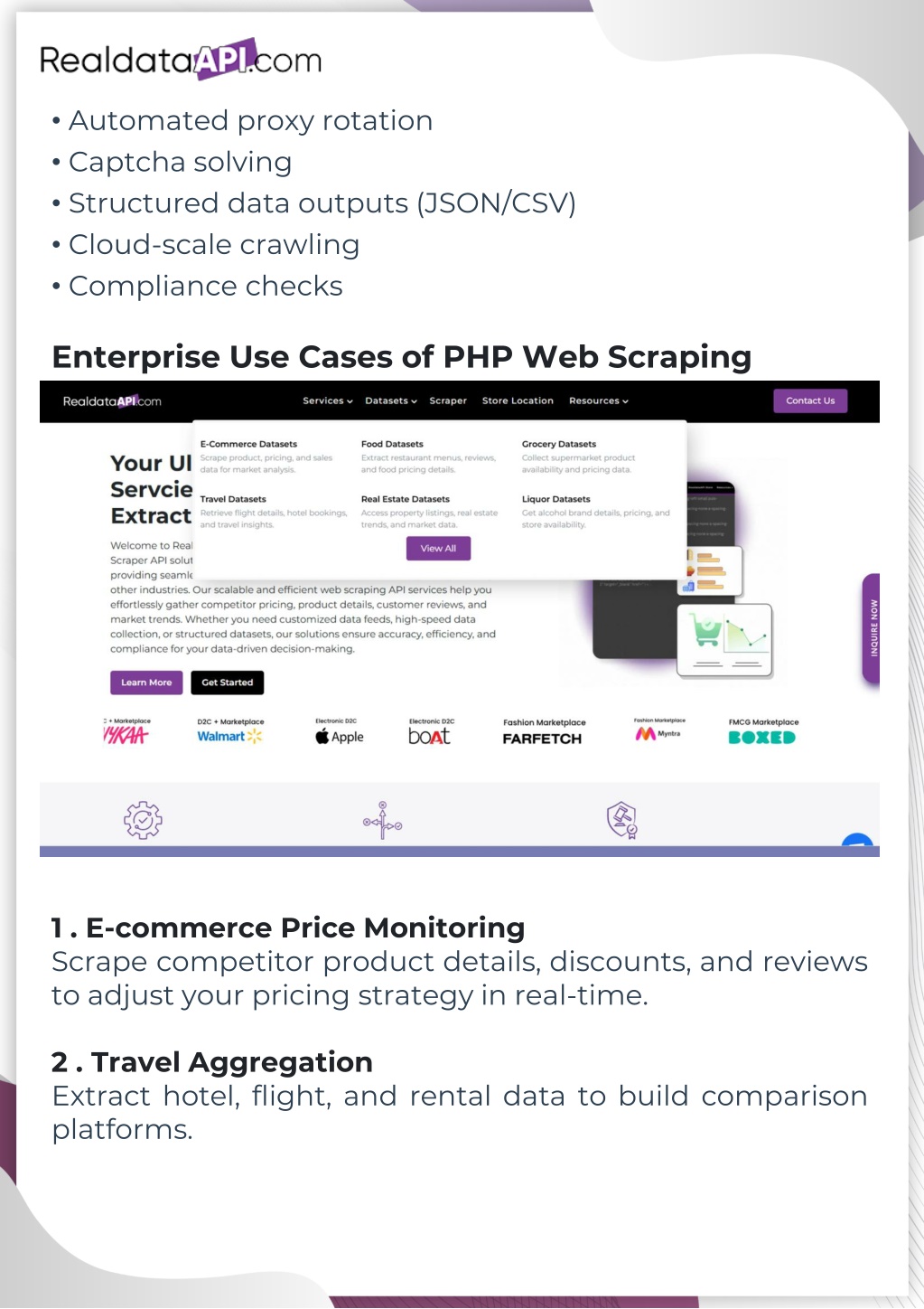 10. • Automated proxy rotation • Captcha solving • Structured data outputs (JSON/CSV) • Cloud-scale crawling • Compliance checks Enterprise Use Cases of PHP Web Scraping 1 . E-commerce Price Monitoring Scrape competitor product details, discounts, and reviews to adjust your pricing strategy in real-time. 2 . Travel Aggregation Extract hotel, flight, and rental data to build comparison platforms.