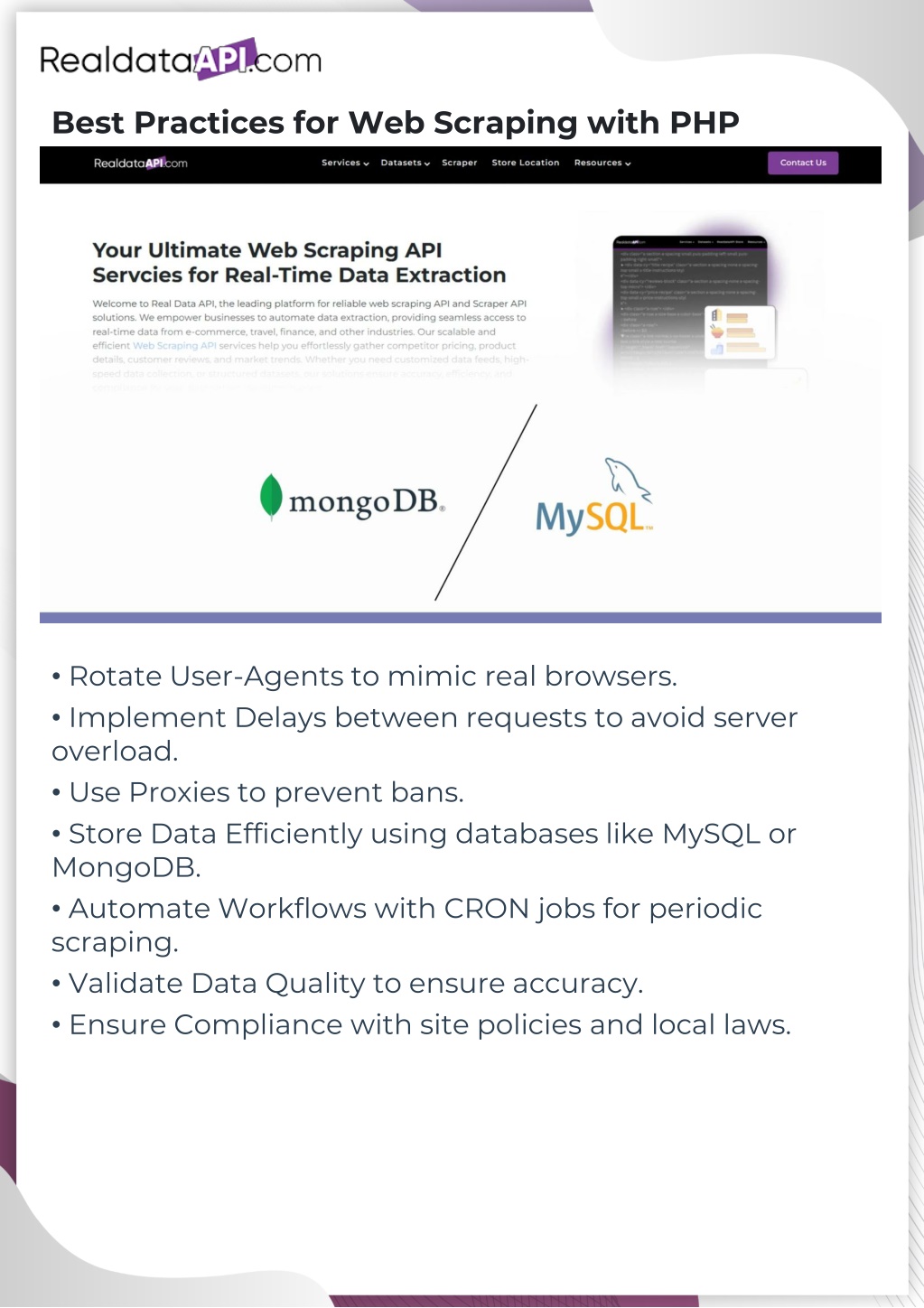 14. Best Practices for Web Scraping with PHP • Rotate User-Agents to mimic real browsers. • Implement Delays between requests to avoid server overload. • Use Proxies to prevent bans. • Store Data Efficiently using databases like MySQL or MongoDB. • Automate Workflows with CRON jobs for periodic scraping. • Validate Data Quality to ensure accuracy. • Ensure Compliance with site policies and local laws.