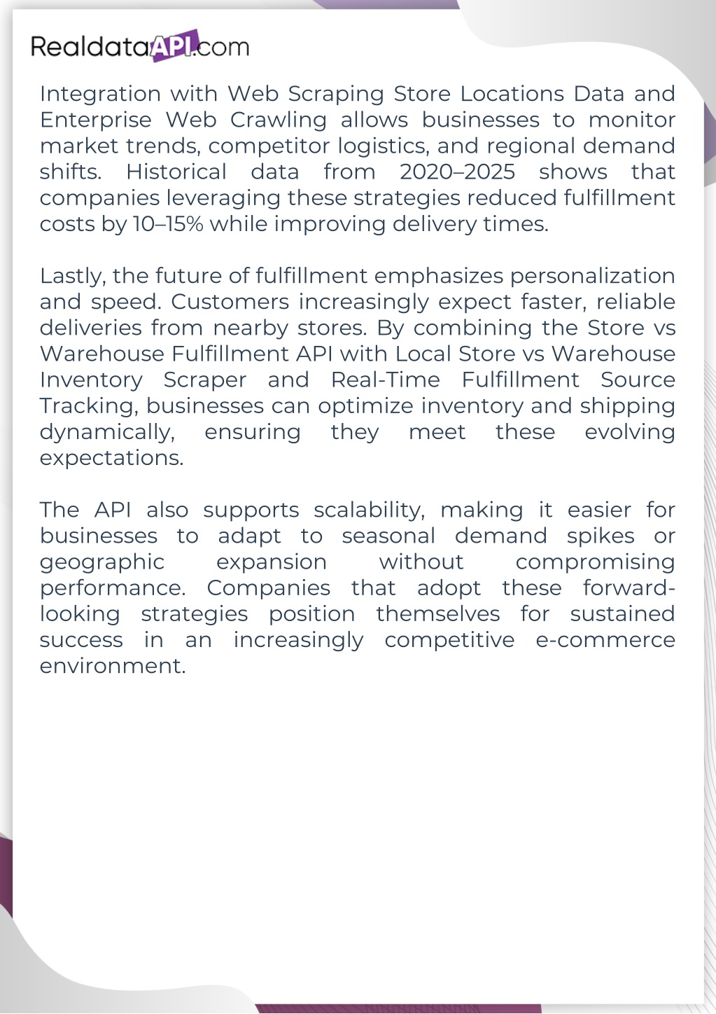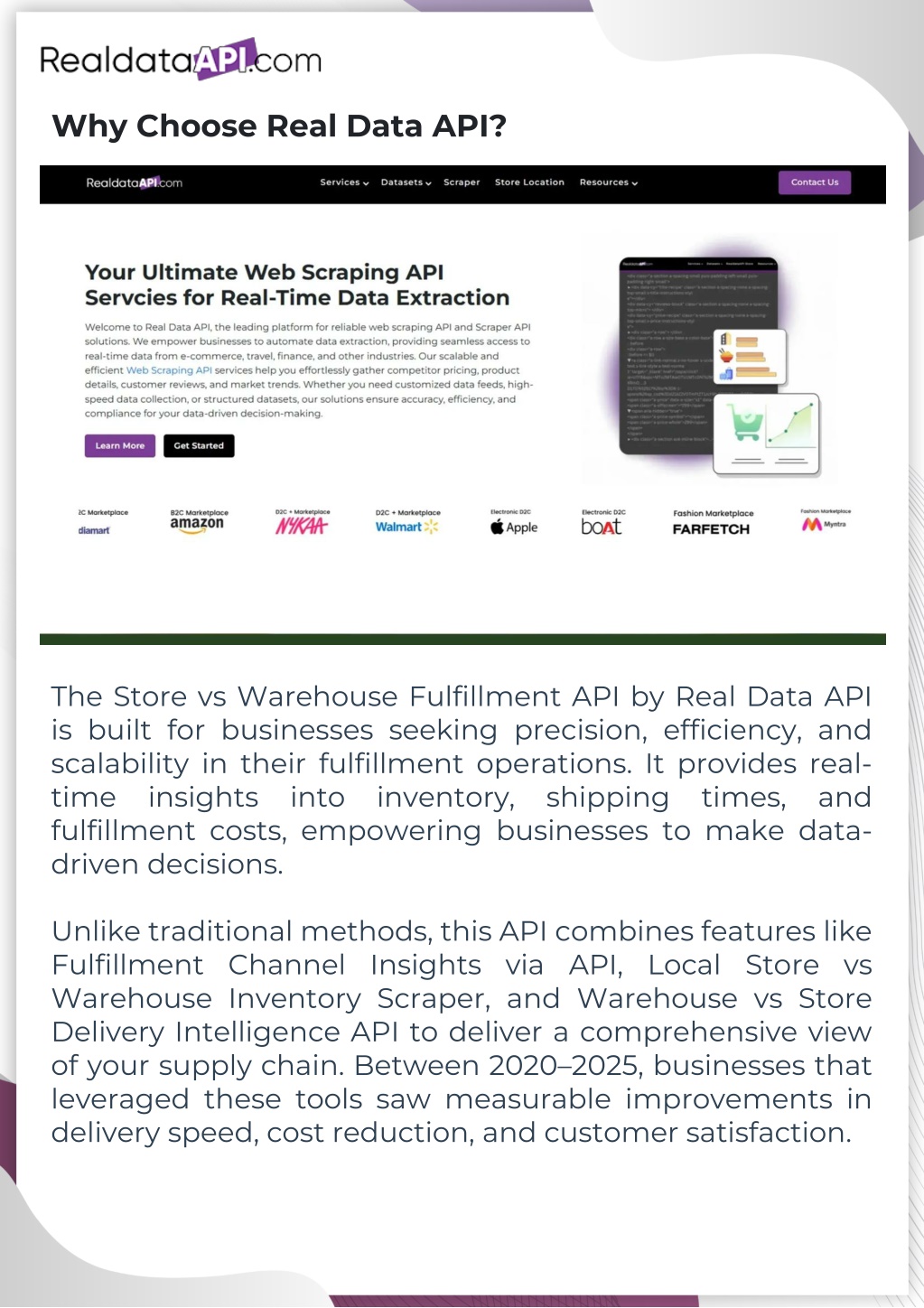 Why Choose Real Data API? UAE Food Delivery Price Tracking API for Monitoring Prices, Ratings & Delivery Times in UAE & KSA The Store vs Warehouse Fulfillment API by Real Data API is built for businesses seeking precision, efficiency, and scalability in their fulfillment operations. It provides real- time insights into inventory, shipping times, and fulfillment costs, empowering businesses to make data- driven decisions. Unlike traditional methods, this API combines features like Fulfillment Channel Insights via API, Local Store vs Warehouse Inventory Scraper, and Warehouse vs Store Delivery Intelligence API to deliver a comprehensive view of your supply chain. Between 2020–2025, businesses that leveraged these tools saw measurable improvements in delivery speed, cost reduction, and customer satisfaction.