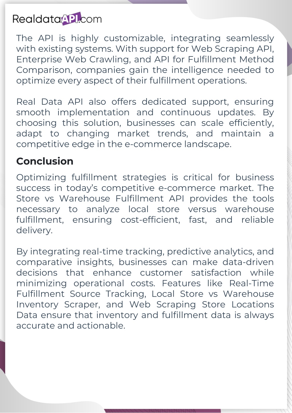 The API is highly customizable, integrating seamlessly with existing systems. With support for Web Scraping API, Enterprise Web Crawling, and API for Fulfillment Method Comparison, companies gain the intelligence needed to optimize every aspect of their fulfillment operations. Real Data API also offers dedicated support, ensuring smooth implementation and continuous updates. By choosing this solution, businesses can scale efficiently, adapt to changing market trends, and maintain a competitive edge in the e-commerce landscape. Conclusion UAE Food Delivery Price Tracking API for Monitoring Prices, Ratings & Delivery Times in UAE & KSA necessary to analyze local store versus warehouse fulfillment, ensuring cost-efficient, fast, and reliable delivery. Optimizing fulfillment strategies is critical for business success in today’s competitive e-commerce market. The Store vs Warehouse Fulfillment API provides the tools By integrating real-time tracking, predictive analytics, and comparative insights, businesses can make data-driven decisions that enhance customer satisfaction while minimizing operational costs. Features like Real-Time Fulfillment Source Tracking, Local Store vs Warehouse Inventory Scraper, and Web Scraping Store Locations Data ensure that inventory and fulfillment data is always accurate and actionable.