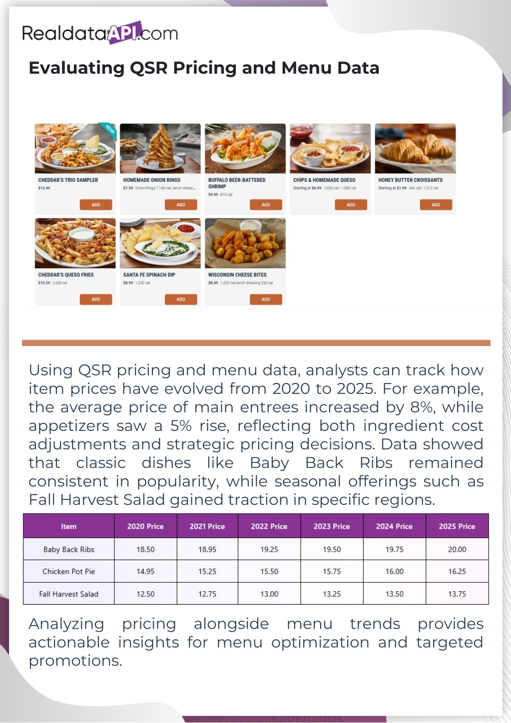 Evaluating QSR Pricing and Menu Data Using QSR pricing and menu data, analysts can track how item prices have evolved from 2020 to 2025. For example, the average price of main entrees increased by 8%, while appetizers saw a 5% rise, reflecting both ingredient cost adjustments and strategic pricing decisions. Data showed that classic dishes like Baby Back Ribs remained consistent in popularity, while seasonal offerings such as Fall Harvest Salad gained traction in specific regions. Analyzing pricing alongside menu trends provides actionable insights for menu optimization and targeted promotions.