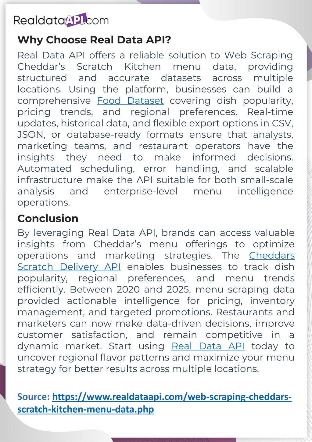 Why Choose Real Data API? Real Data API offers a reliable solution to Web Scraping Cheddar’s Scratch Kitchen structured and accurate locations. Using the platform, businesses can build a comprehensive Food Dataset covering dish popularity, pricing trends, and regional preferences. Real-time updates, historical data, and flexible export options in CSV, JSON, or database-ready formats ensure that analysts, marketing teams, and restaurant operators have the insights they need to make Automated scheduling, error handling, and scalable infrastructure make the API suitable for both small-scale analysis and enterprise-level operations. Conclusion By leveraging Real Data API, brands can access valuable insights from Cheddar’s menu offerings to optimize operations and marketing strategies. The Scratch Delivery API enables businesses to track dish popularity, regional preferences, and menu trends efficiently. Between 2020 and 2025, menu scraping data provided actionable intelligence for pricing, inventory management, and targeted promotions. Restaurants and marketers can now make data-driven decisions, improve customer satisfaction, and remain competitive in a dynamic market. Start using Real Data API today to uncover regional flavor patterns and maximize your menu strategy for better results across multiple locations. menu datasets data, across providing multiple informed decisions. menu intelligence Cheddars Source: https://www.realdataapi.com/web-scraping-cheddars- scratch-kitchen-menu-data.php