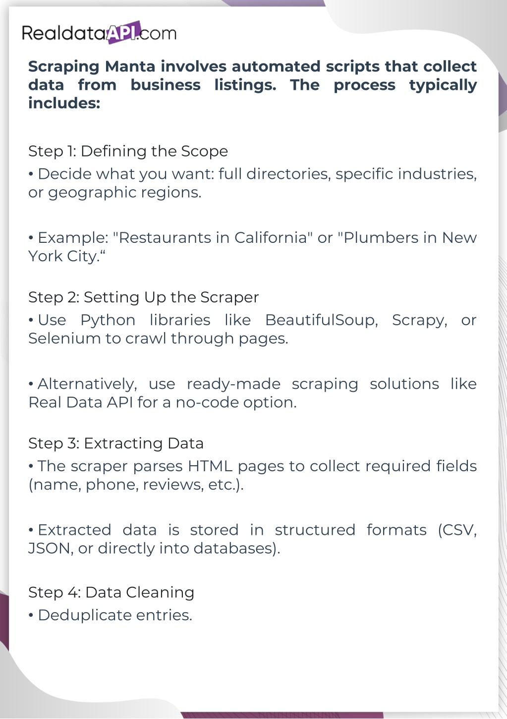 9. Scraping Manta involves automated scripts that collect data from business listings. The process typically includes: Step 1: Defining the Scope • Decide what you want: full directories, specific industries, or geographic regions. • Example: "Restaurants in California" or "Plumbers in New York City.“ Step 2: Setting Up the Scraper • Use Python libraries like BeautifulSoup, Scrapy, or Selenium to crawl through pages. • Alternatively, use ready-made scraping solutions like Real Data API for a no-code option. Step 3: Extracting Data • The scraper parses HTML pages to collect required fields (name, phone, reviews, etc.). • Extracted data is stored in structured formats (CSV, JSON, or directly into databases). Step 4: Data Cleaning • Deduplicate entries.