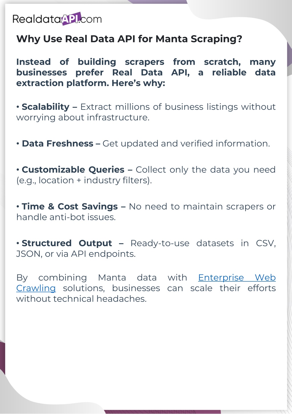 11. Why Use Real Data API for Manta Scraping? Instead of building scrapers from scratch, many businesses prefer Real Data API, a reliable data extraction platform. Here’s why: • Scalability – Extract millions of business listings without worrying about infrastructure. • Data Freshness – Get updated and verified information. • Customizable Queries – Collect only the data you need (e.g., location + industry filters). • Time & Cost Savings – No need to maintain scrapers or handle anti-bot issues. • Structured Output – Ready-to-use datasets in CSV, JSON, or via API endpoints. By Crawling solutions, businesses can scale their efforts without technical headaches. combining Manta data with Enterprise Web
