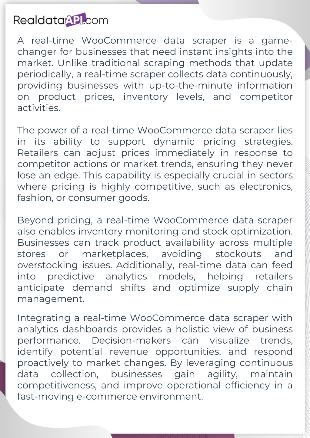 9. A real-time WooCommerce data scraper is a game- changer for businesses that need instant insights into the market. Unlike traditional scraping methods that update periodically, a real-time scraper collects data continuously, providing businesses with up-to-the-minute information on product prices, inventory levels, and competitor activities. The power of a real-time WooCommerce data scraper lies in its ability to support dynamic pricing strategies. Retailers can adjust prices immediately in response to competitor actions or market trends, ensuring they never lose an edge. This capability is especially crucial in sectors where pricing is highly competitive, such as electronics, fashion, or consumer goods. Beyond pricing, a real-time WooCommerce data scraper also enables inventory monitoring and stock optimization. Businesses can track product availability across multiple stores or marketplaces, overstocking issues. Additionally, real-time data can feed into predictive analytics anticipate demand shifts and optimize supply chain management. avoiding stockouts and models, helping retailers Integrating a real-time WooCommerce data scraper with analytics dashboards provides a holistic view of business performance. Decision-makers identify potential revenue opportunities, and respond proactively to market changes. By leveraging continuous data collection, businesses competitiveness, and improve operational efficiency in a fast-moving e-commerce environment. can visualize trends, gain agility, maintain