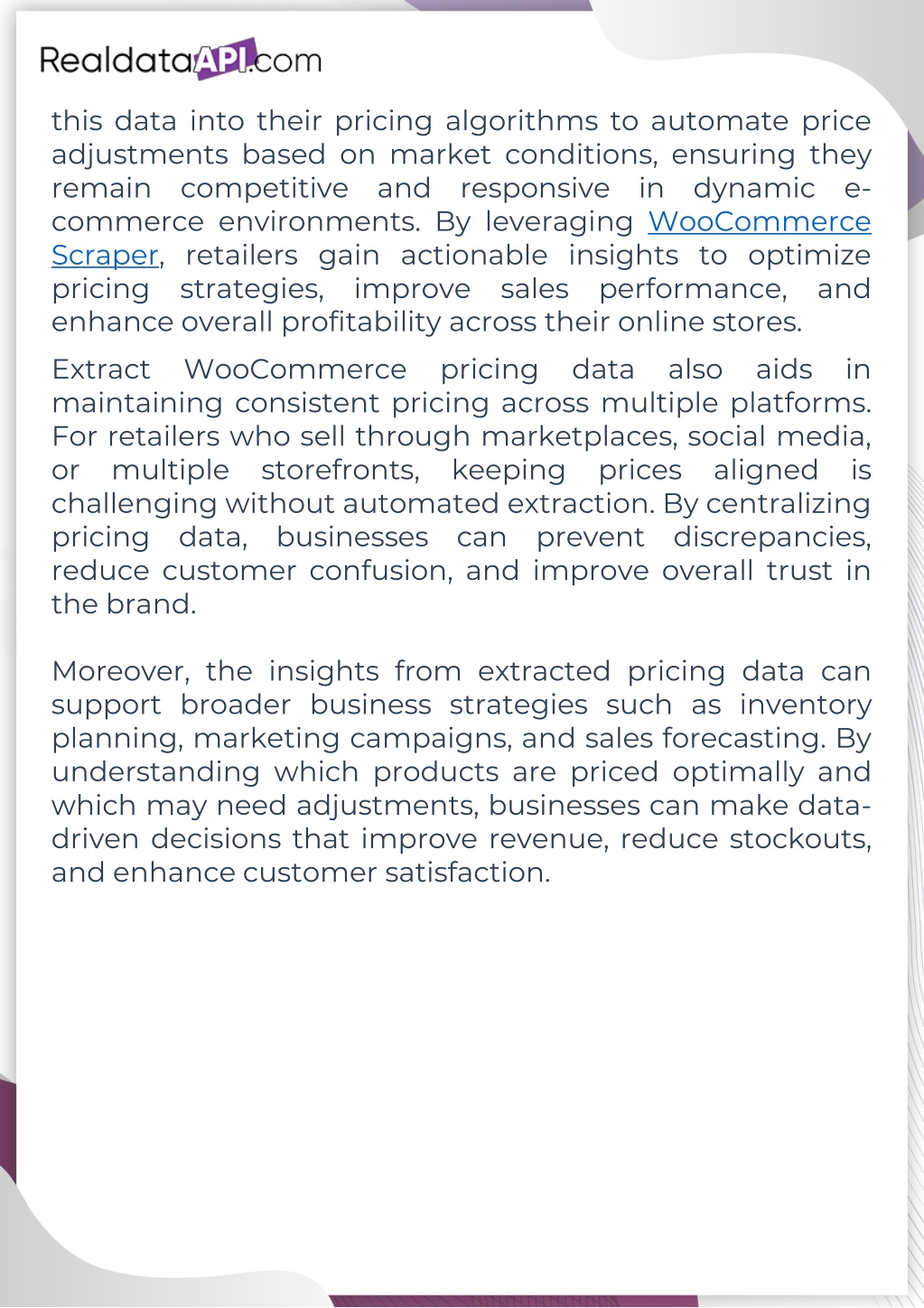 6. this data into their pricing algorithms to automate price adjustments based on market conditions, ensuring they remain competitive and responsive in dynamic e-commerce environments. By leveraging WooCommerce Scraper, retailers gain actionable insights to optimize pricing strategies, improve sales performance, and enhance overall profitability across their online stores. Extract WooCommerce pricing data also aids in maintaining consistent pricing across multiple platforms. For retailers who sell through marketplaces, social media, or multiple storefronts, keeping prices aligned is challenging without automated extraction. By centralizing pricing data, businesses can prevent discrepancies, reduce customer confusion, and improve overall trust in the brand. Moreover, the insights from extracted pricing data can support broader business strategies such as inventory planning, marketing campaigns, and sales forecasting. By understanding which products are priced optimally and which may need adjustments, businesses can make data-driven decisions that improve revenue, reduce stockouts, and enhance customer satisfaction.