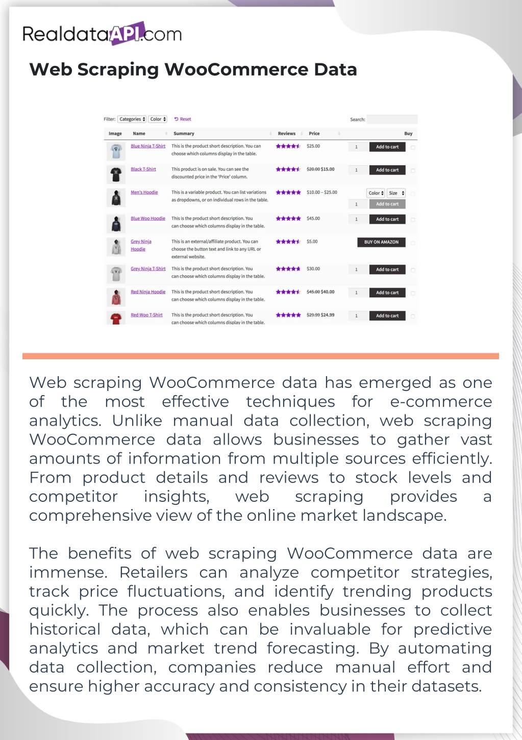 12. avoid errors, save time, and ensure their product catalogs remain accurate and up-to-date. The API can handle high volumes of requests, making it suitable for stores with extensive inventories. Another advantage of the WooCommerce Scraping API is its compatibility with other tools and analytics platforms. Retailers can combine API data with dashboards, machine learning models, and marketing tools to derive actionable insights. The API also supports real-time updates, ensuring that businesses respond instantly to market changes, manage stock effectively, and maintain a competitive edge. Overall, integrating a WooCommerce Scraping API empowers e-commerce businesses to automate data collection, enhance decision-making, and achieve operational efficiency. It transforms data from a passive resource into an active driver of growth and competitiveness in the online marketplace. Why Choose Real Data API? Real Data API provides a comprehensive solution for WooCommerce data scraping and price monitoring. With robust WooCommerce API data provider for product price monitoring capabilities, businesses gain real-time insights into product pricing, inventory, and competitor activity. The API supports scalable WooCommerce product data extraction services, enabling automated collection of large datasets while maintaining data accuracy. From 2020 to 2025, businesses using Real Data API reported a 40% reduction in manual data entry and a 35% improvement in decision-making speed. With endpoints for Web Scraping WooCommerce data, Real-time WooCommerce data scraper, and WooCommerce