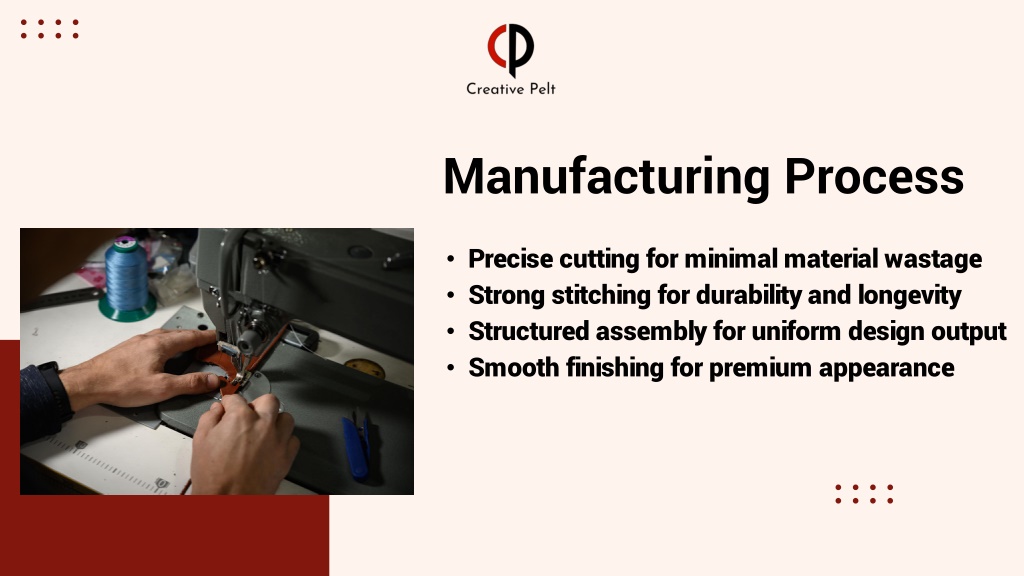 Manufacturing Process • Precise cutting for minimal material wastage • Strong stitching for durability and longevity • Structured assembly for uniform design output • Smooth finishing for premium appearance
