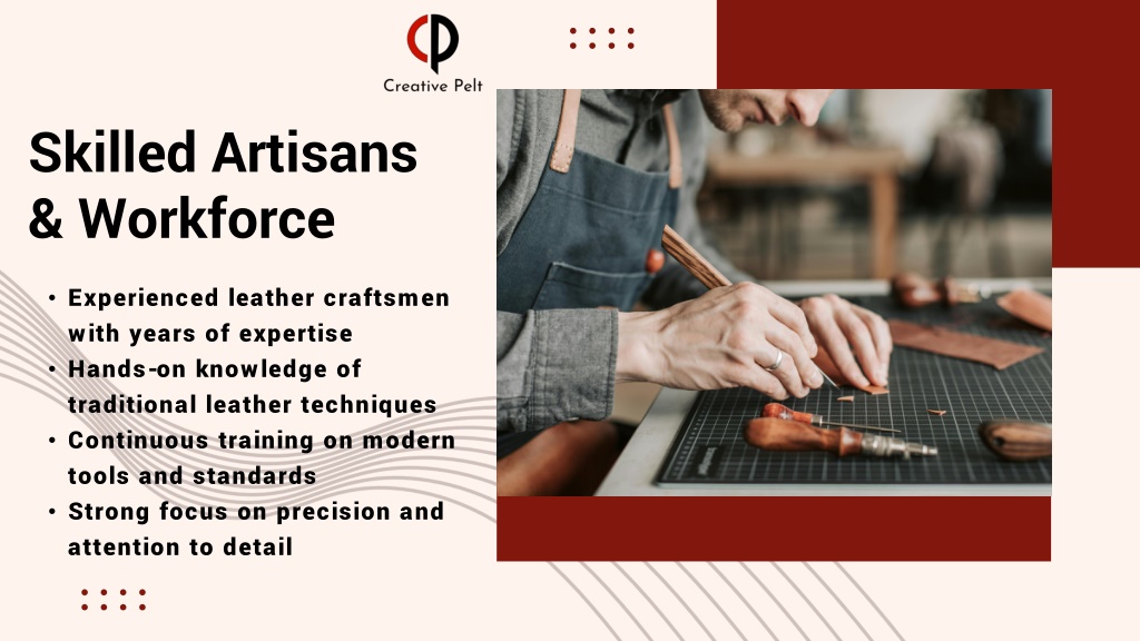 Skilled Artisans & Workforce • Experienced leather craftsmen with years of expertise • Hands-on knowledge of traditional leather techniques • Continuous training on modern tools and standards • Strong focus on precision and attention to detail