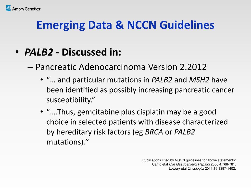 Emerging Data & NCCN Guidelines • PALB2 - Discussed in: • Pancreatic Adenocarcinoma Version 2.2012 • “… and particular mutations in PALB2 and MSH2 have been identified as possibly increasing pancreatic cancer susceptibility.” • “….Thus, gemcitabine plus cisplatin may be a good choice in selected patients with disease characterized by hereditary risk factors (egBRCA or PALB2 mutations).” Publications cited by NCCN guidelines for above statements: Canto etalClinGastroenterolHepatol 2006;4:766-781. Lowery etalOncologist 2011;16:1397-1402.