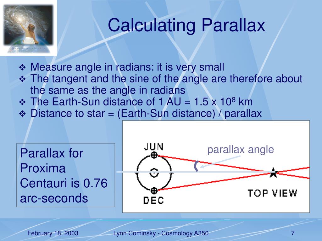 Distances to Stars Parallax : determined by the change of position of a nearby star with respect to the distant stars, as seen from the Earth at two different times separated by 6 months. Lynn Cominsky - Cosmology A350